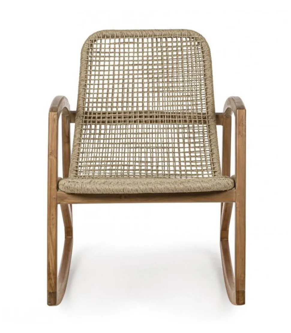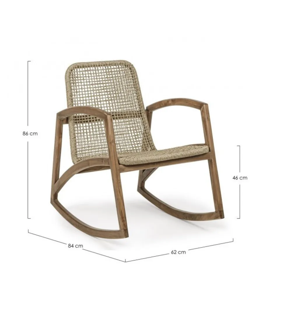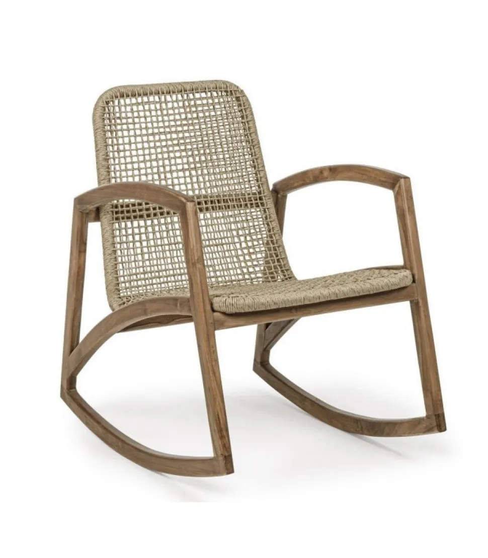 Poltrona Dondolo Adelita Struttura In Legno Teak, Seduta E Schienale Con Intreccio In Fibra Sintetica (Viro). Finitura Con Vernice A Base D’Acqua. Si Raccomanda Di Non Esporre L’Articolo Alla Luce Diretta Del Sole Ed Alle Intemperie. – Dimensioni In Cm. 62 (L.) 84 (P.) 86 ( H.) 46 ( H1)