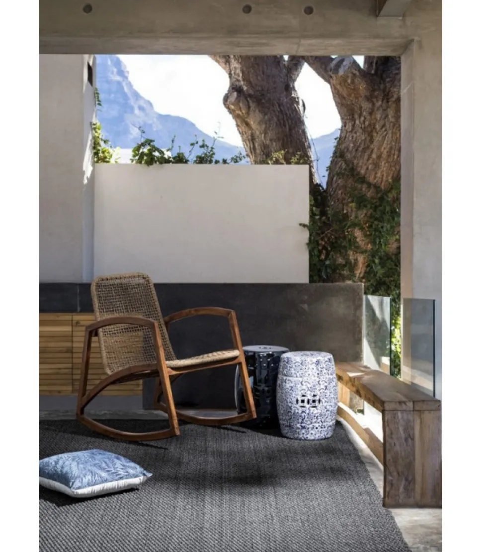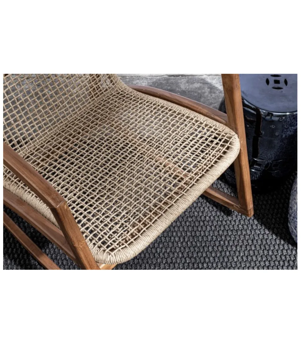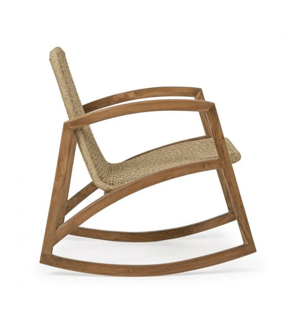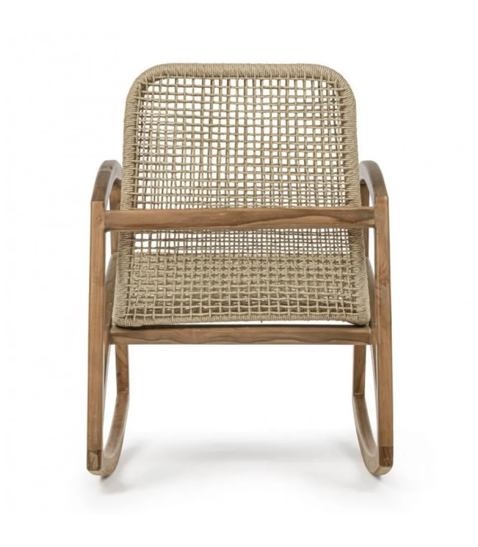 Poltrona Dondolo Adelita Struttura In Legno Teak, Seduta E Schienale Con Intreccio In Fibra Sintetica (Viro). Finitura Con Vernice A Base D’Acqua. Si Raccomanda Di Non Esporre L’Articolo Alla Luce Diretta Del Sole Ed Alle Intemperie. – Dimensioni In Cm. 62 (L.) 84 (P.) 86 ( H.) 46 ( H1)