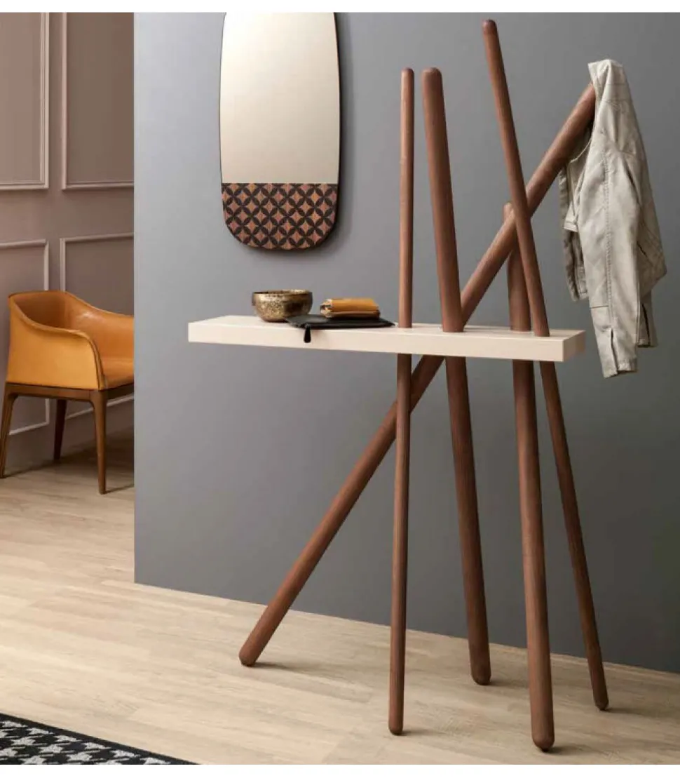 Wood E Due Oggetti In Uno: Un Appendiabiti E Una Consolle In Un Solo Elemento; Un Oggetto Che Si Sviluppa In Orizzontale, Nel Piano In Legno Tinto, Ed Anche In Verticale, Nelle Aste Appendiabiti In Legno. Vario, Leggero E Resistente Come Una Foresta Di Bambu: Una Forma Completamente Nuova, Esteticamente Affascinante.