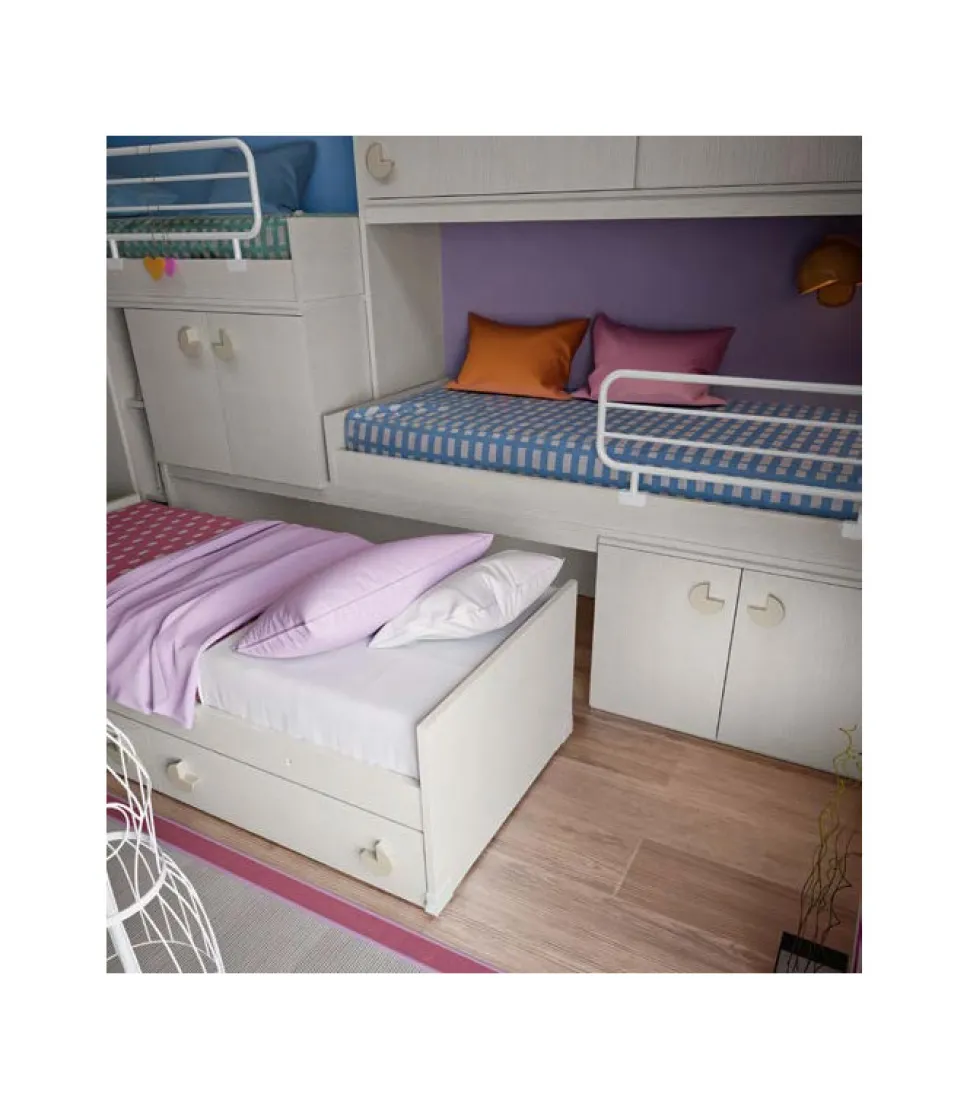Composizione Per Cameretta Tripla Compatta E Comoda. Comprende Tre Comodi Letti, Di Cui Uno Estraibile, Con Reti Per Materassi Da 80X190Cm Incluse, Un Ampio Armadio E Delle Pratiche Mensole.