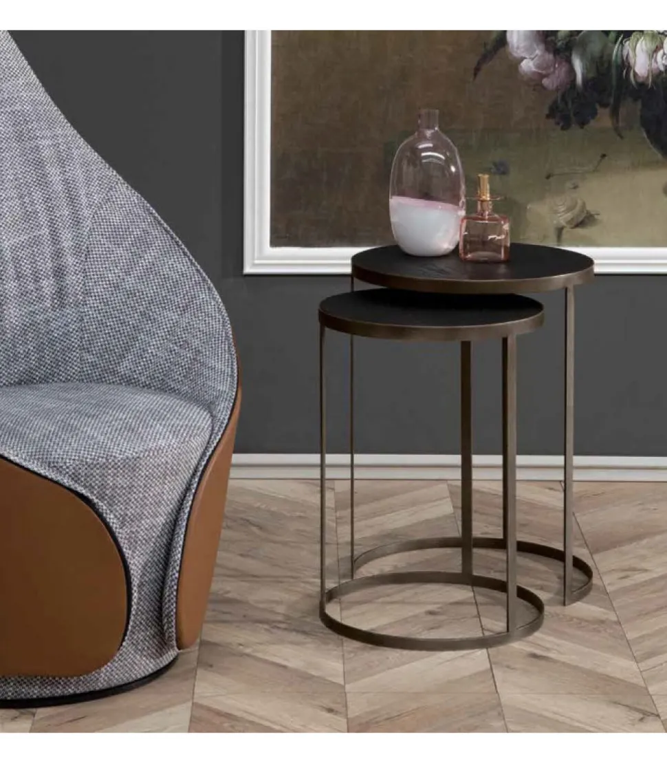 Una Coppia Di Tavolini Che Si Intersecano Per Offrire La Massima Funzionalita Senza Rinunciare Al Design. Metallo Brushed Bronze E Piani In Legno Nelle Nostre Finiture A Tua Scelta.