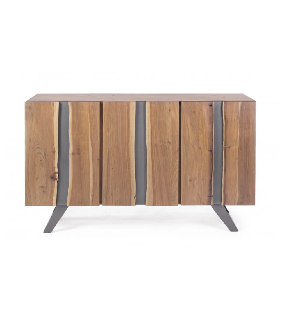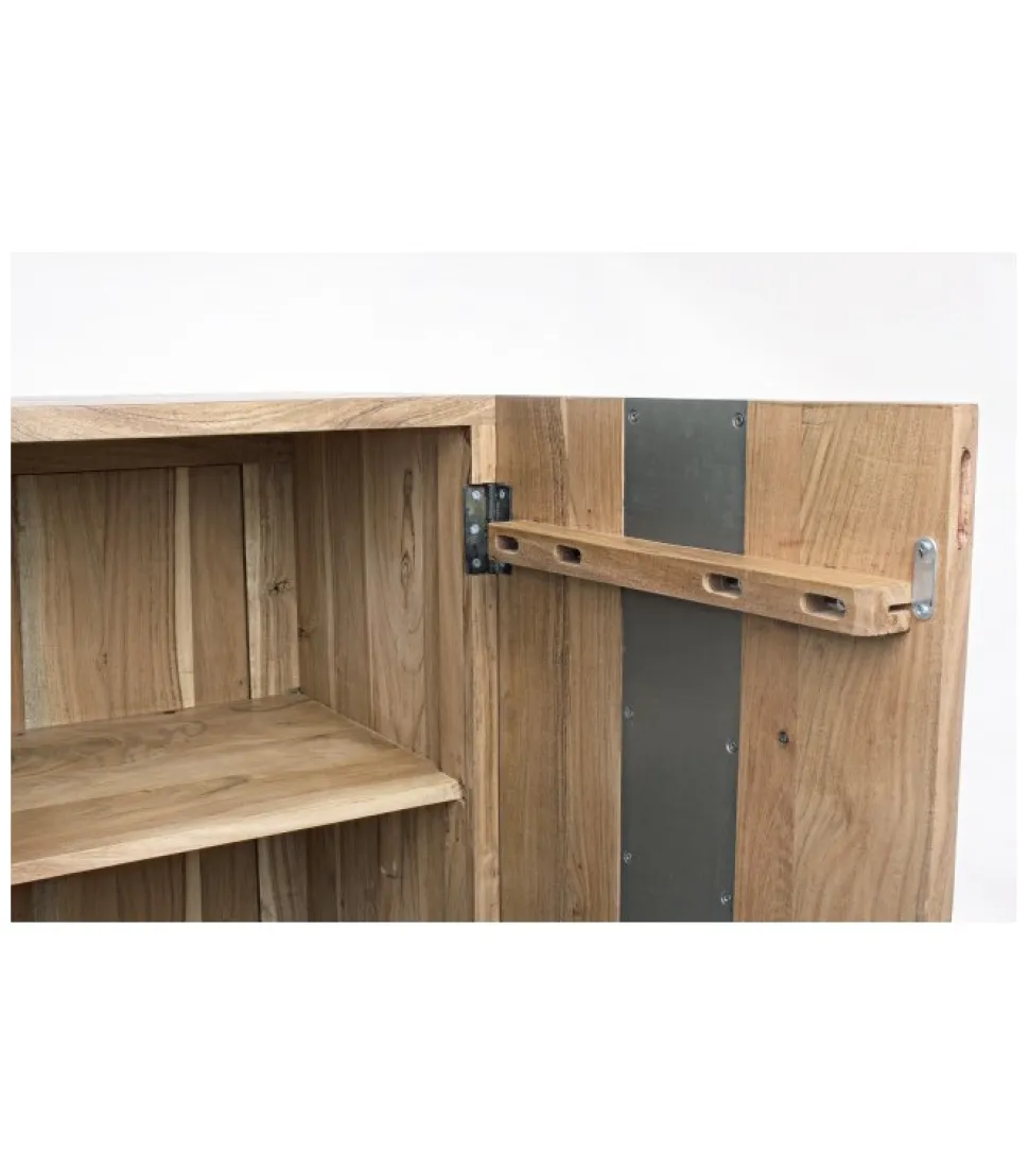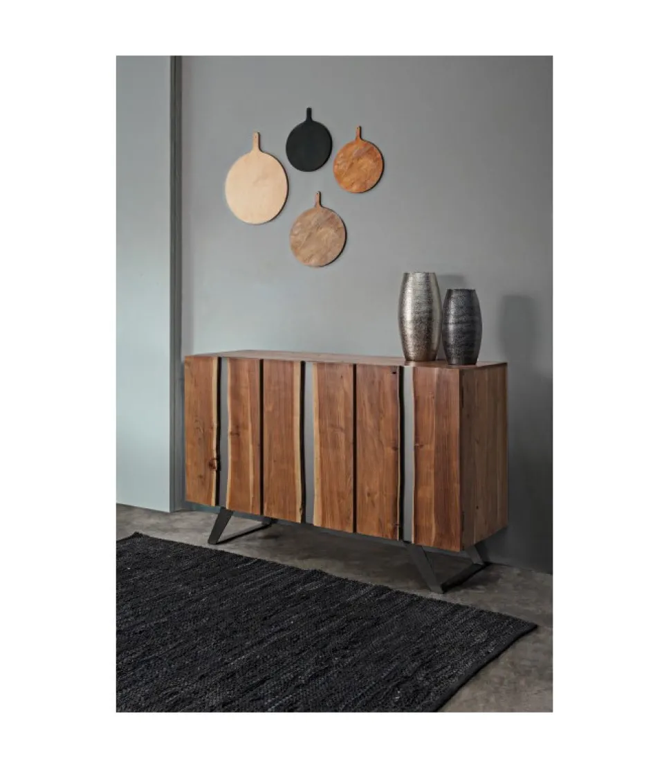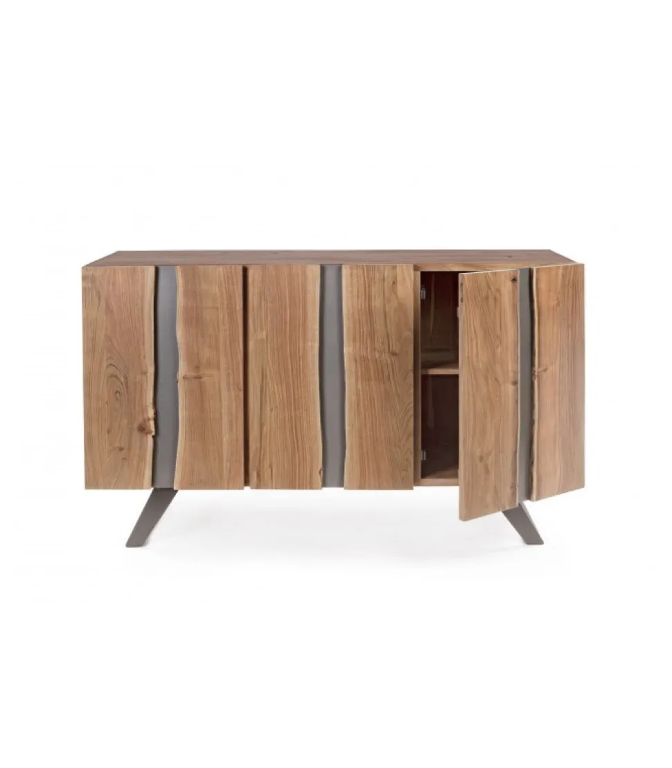 Credenza 3A Aronstruttura In Legno Di Acacia, Gambe In Acciaio Verniciato A Polvere Epossidica- Porte Con Inserti In Metallo- Finitura A Base Di Vernice Poliuretanica- Vano Porta Comprensivo Di Mensola- Gambe Da Assemblare.Dimensioni:145(L) – 45(P) – 90(H)
