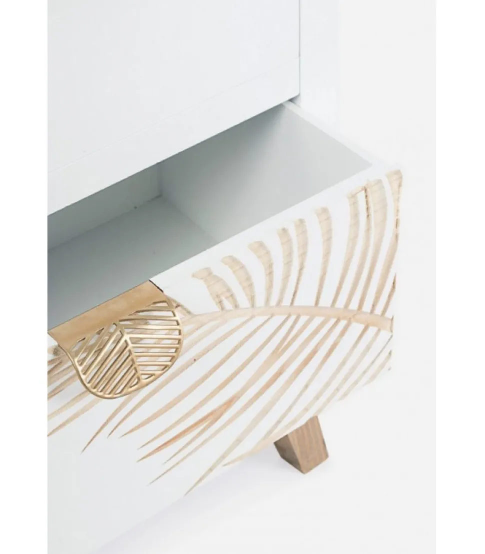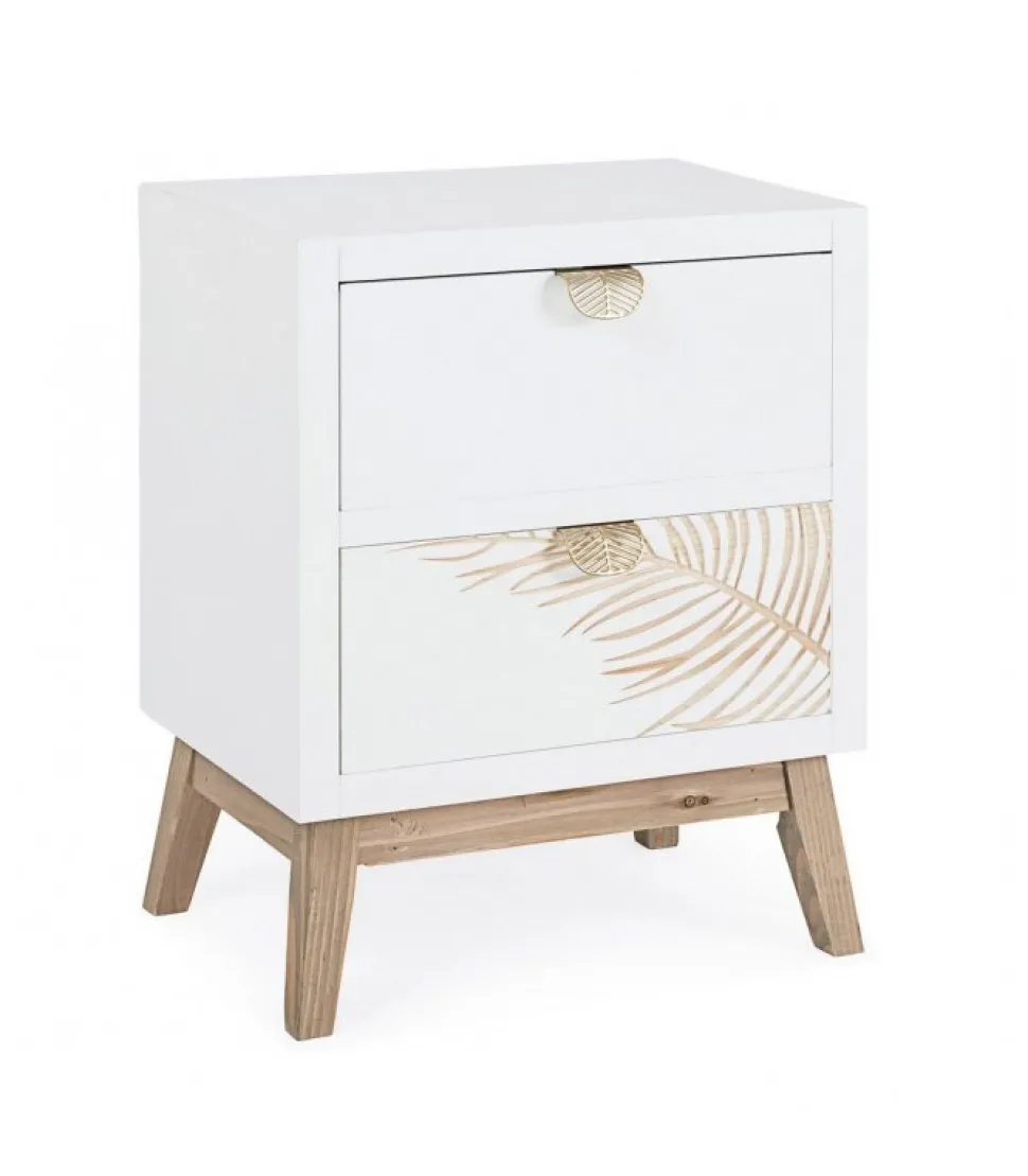 Comodino 2C Folium Struttura In Abete E Mdf, Piano E Schienale In Mdf. Frontale Cassetti In Paulonia (Con Decoro Intarsiato A Mano) E Mdf. Finitura Vernice A Base D’Acqua. Maniglie In Acciaio. Gambe Da Assemblare. – Dimensioni In Cm. 45 (L.) 30 (P.) 60 H