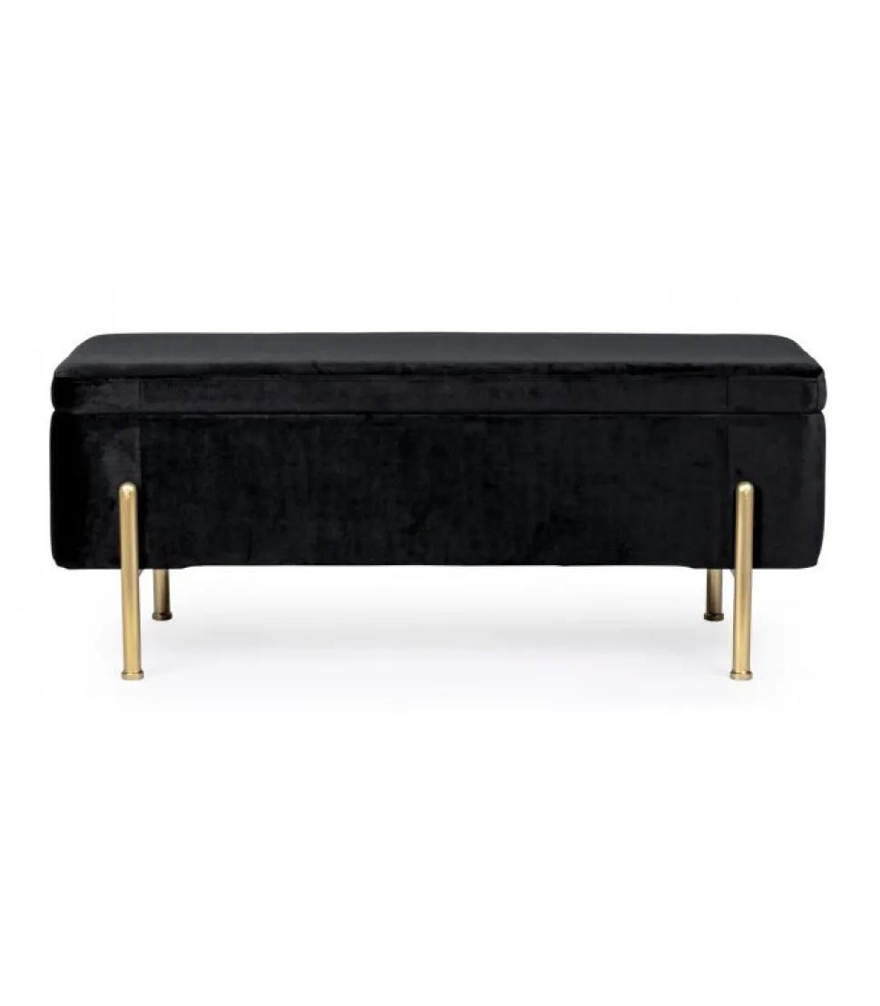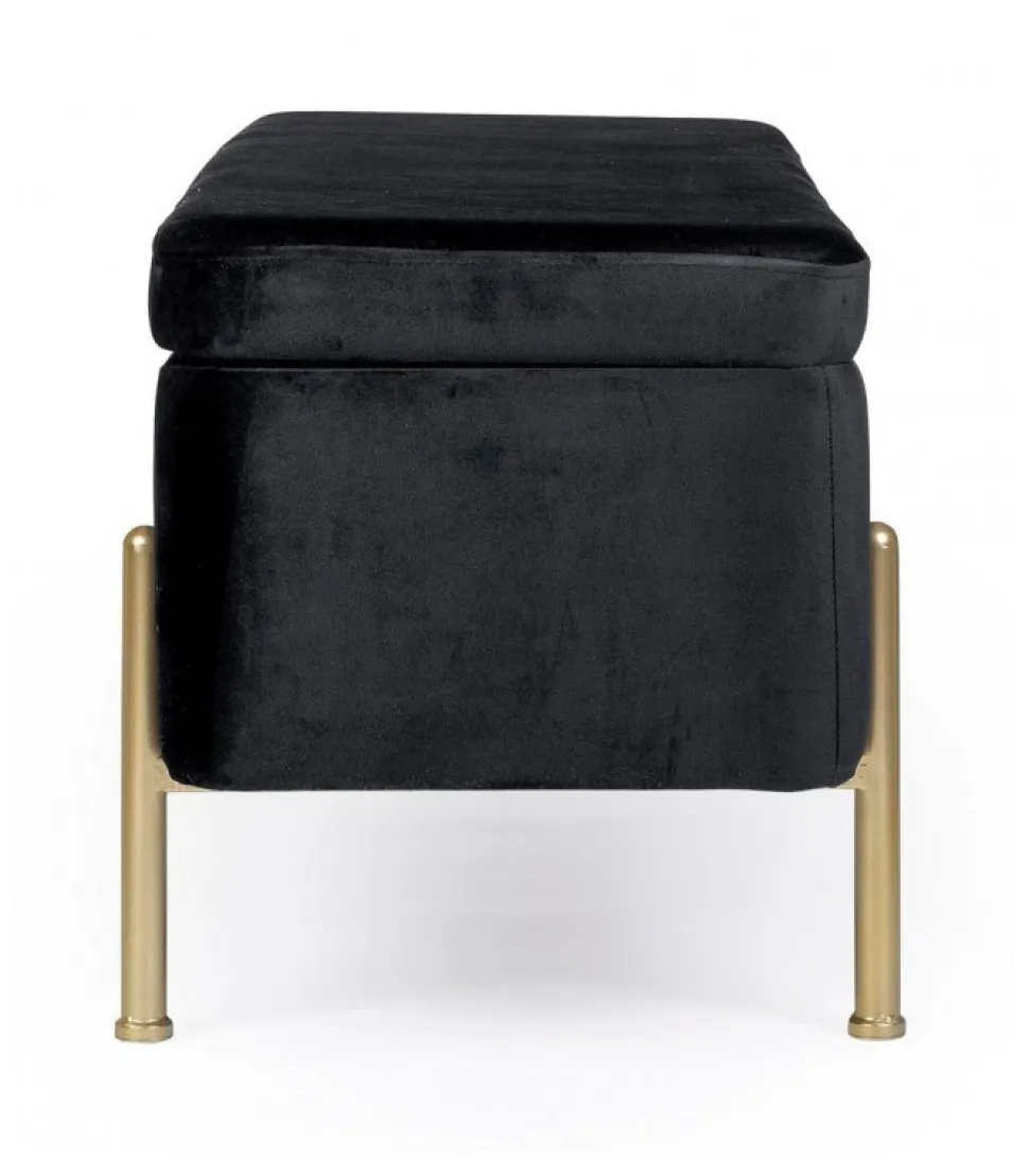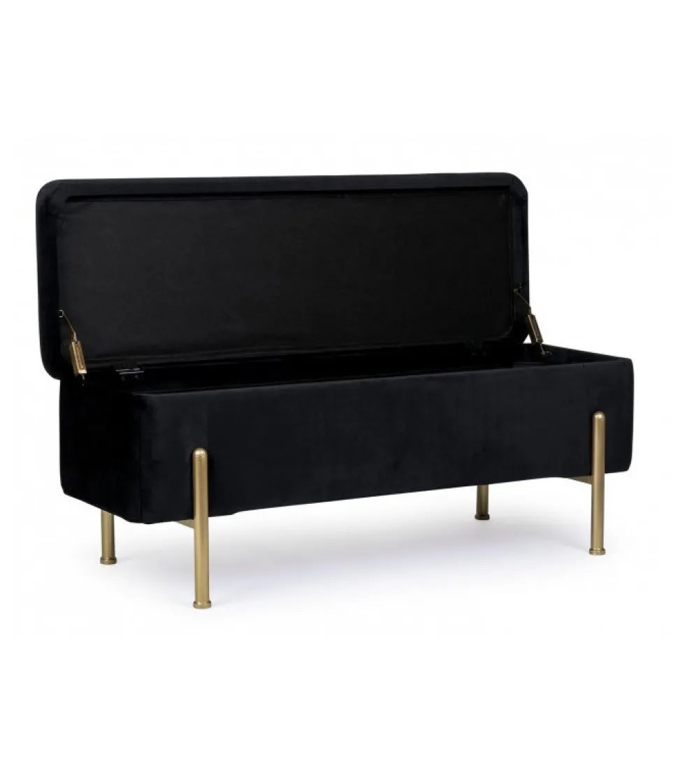 Panca 2P Contenitore Irina Nero Struttura In Mdf E Compensato. Gambe In Acciaio Verniciato Color Oro. Rivestimento In Poliestere Effetto Velluto. Gambe Da Assemblare. – Dimensioni In Cm. 110 (L.) 42 (P.) 42 H
