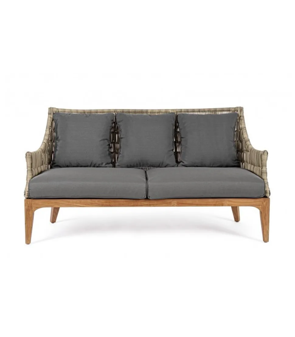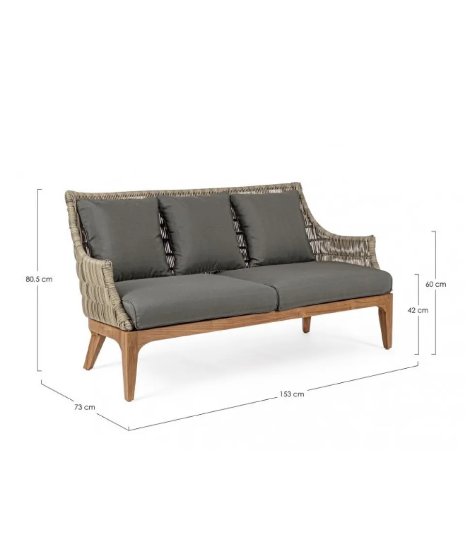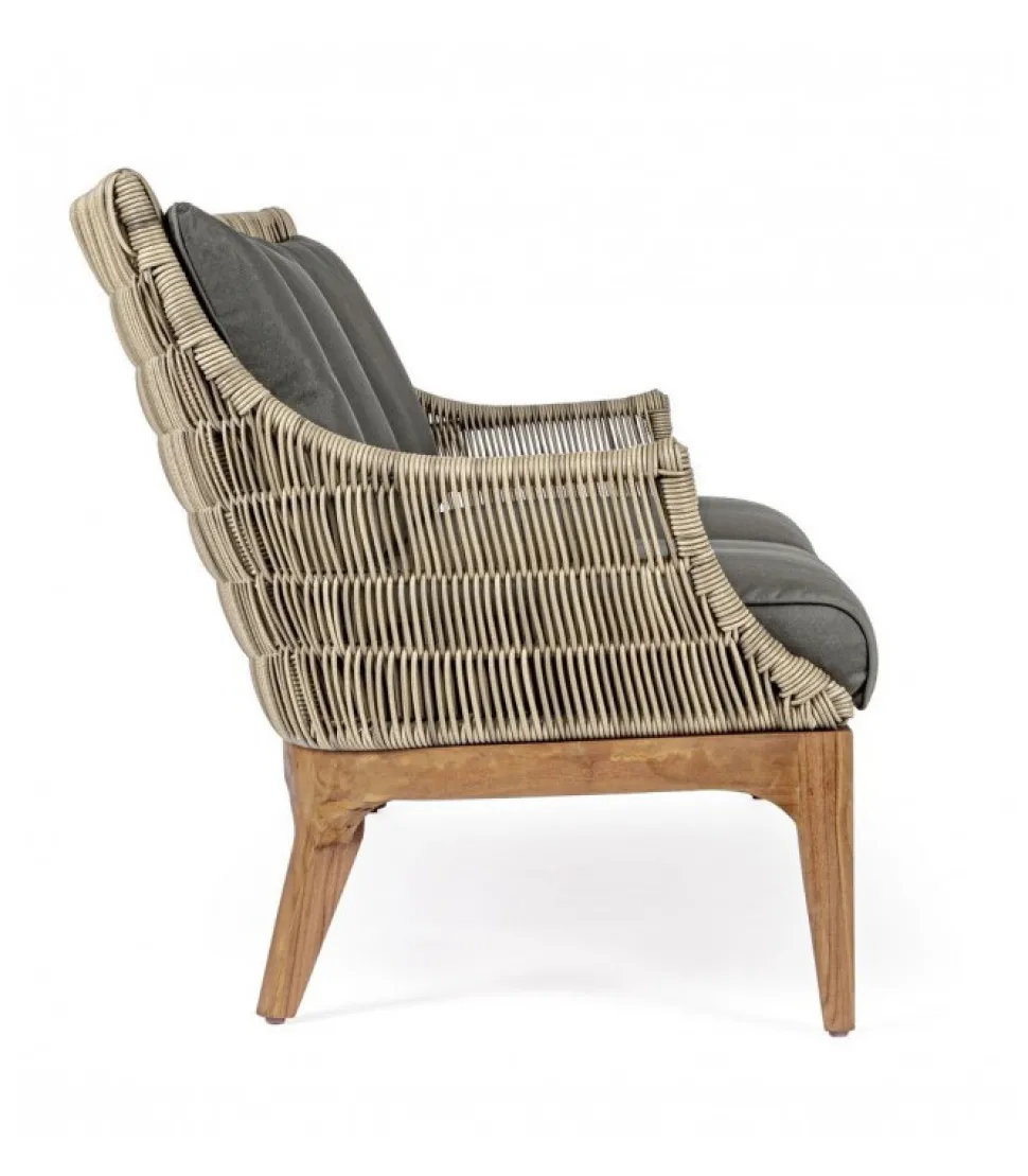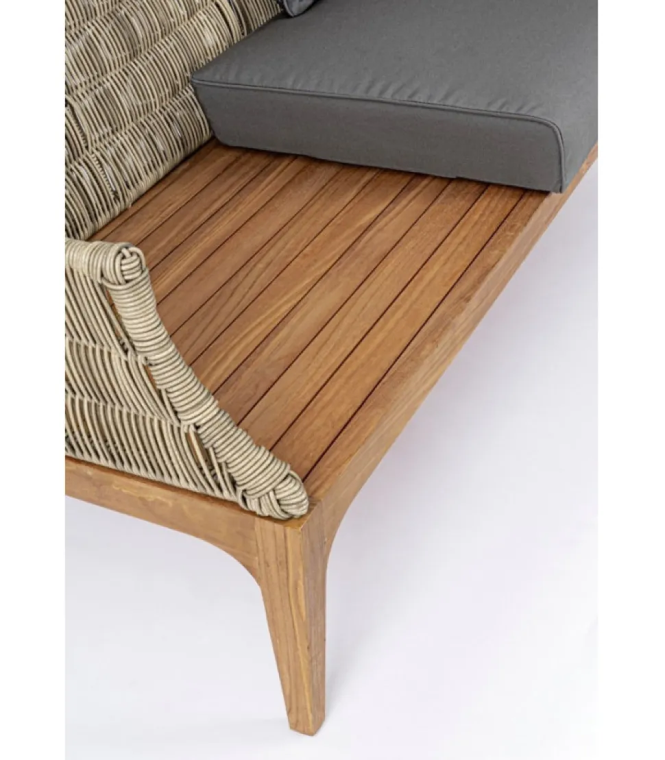 Divano 2-3P C-C Keilani Struttura Schienale In Alluminio Verniciato A Polvere (Poliestere). Seduta E Gambe In Teak – Svlk (Legno Certificato Proveniente Da Foreste Sostenibili). Intreccio Per Esterno In Fibra Sintetica Tonda 5Mm. Cuscini Sfoderabili Con Tessuto Sunproof Olefin (100% Polipropilene). Imbottitura Per Esterno Quick Dry Foam (Antiumidita’). – Dimensioni In Cm. 153 (L.) 73 (P.) 80.5 ( H.) 42 ( H1) – 60 ( H2)
