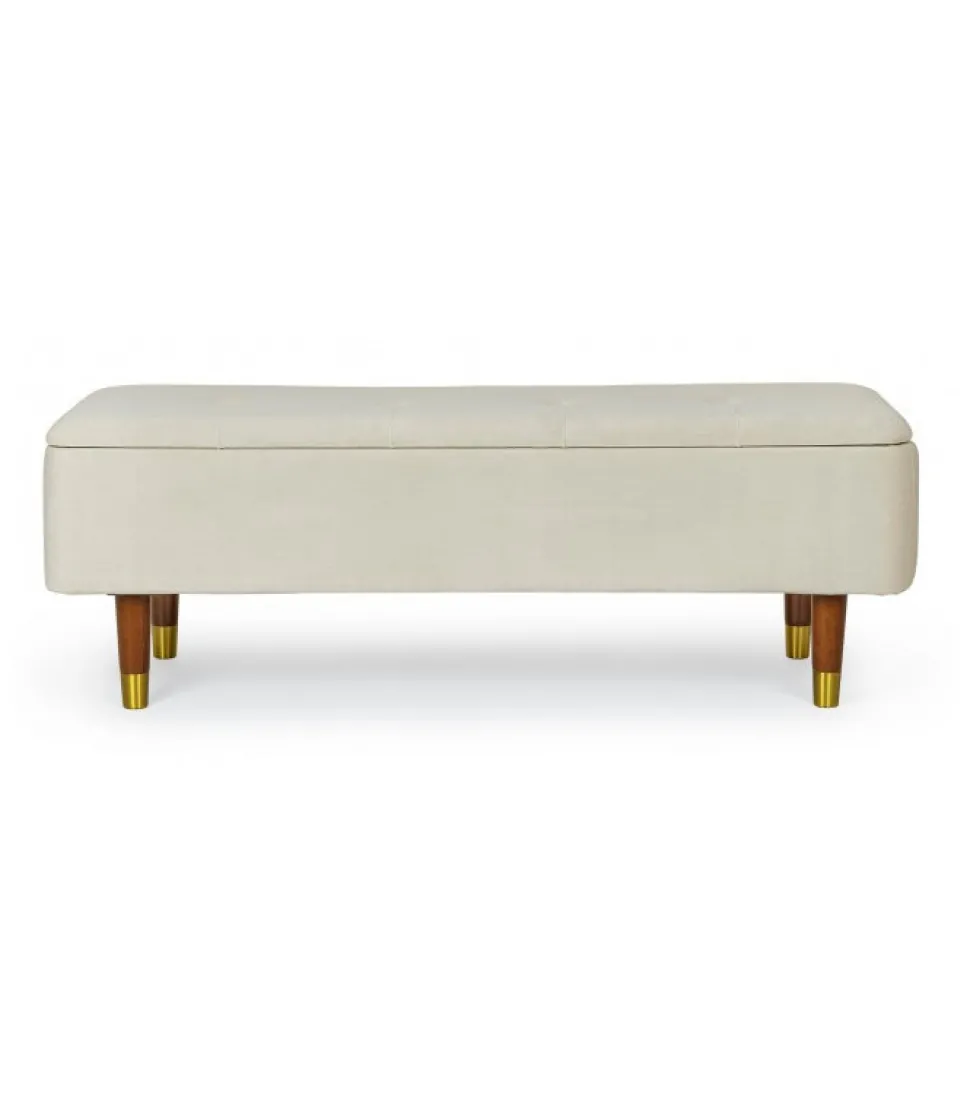 Panca 2P Contenitore Kira Nat Struttura In Mdf E Compensato. Gambe In Rubber Wood E Finali In Acciaio Vernicato Color Oro. Rivestimento In Poliestere Effetto Velluto. Gambe Da Assemblare. – Dimensioni In Cm. 120 (L.) 42 (P.) 42 H