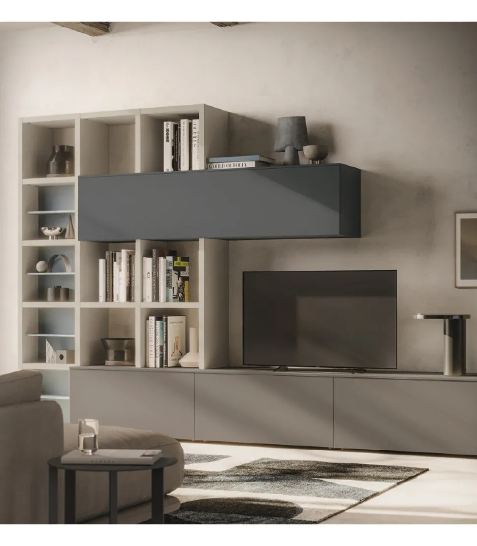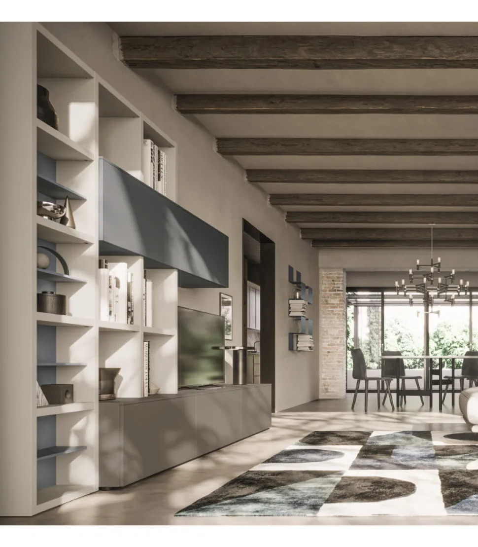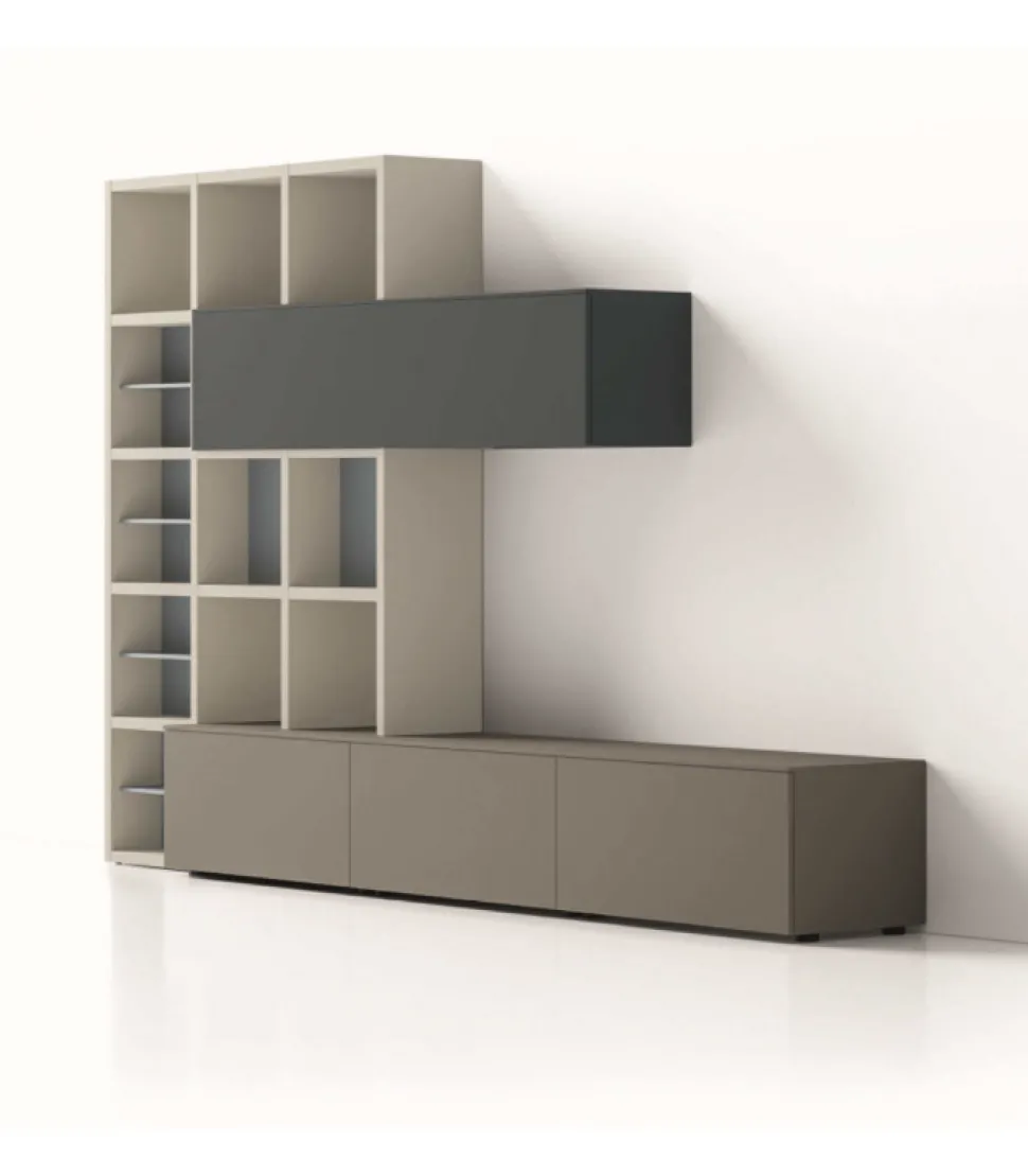 Una Composizione Che Combina Il Sistema Di Contenitori A Quello Delle Librerie A Spalla. I Moduli A Cestone Si Innestano Sulla Struttura Della Libreria E Diventano Base D’Appoggio Per Il Televisore. Allo Stesso Modo, Il Pensile A Vasistas Si Interseca Alla Struttura Della Spalla Creando Un Vivace Gioco Di Geometrie. Per Una Migliore Organizzazione Dello Spazio, La Libreria Puo Essere Completata Con Dei Pratici Alveari Ad Incasso Che Aggiungono Una Funzione Contenitiva Extra.