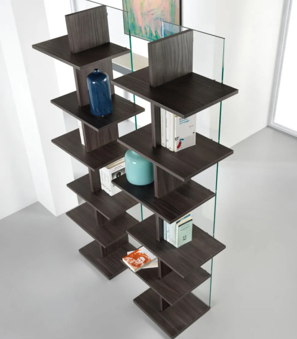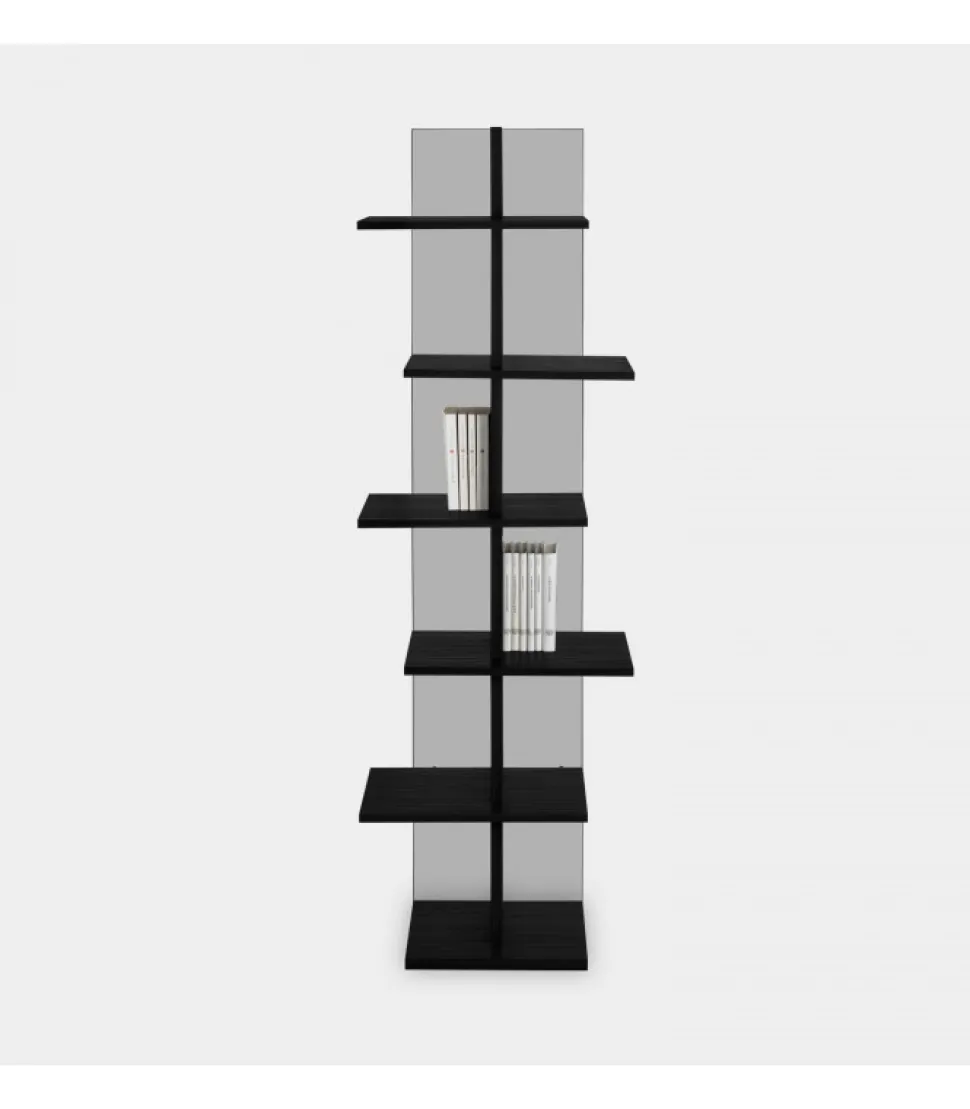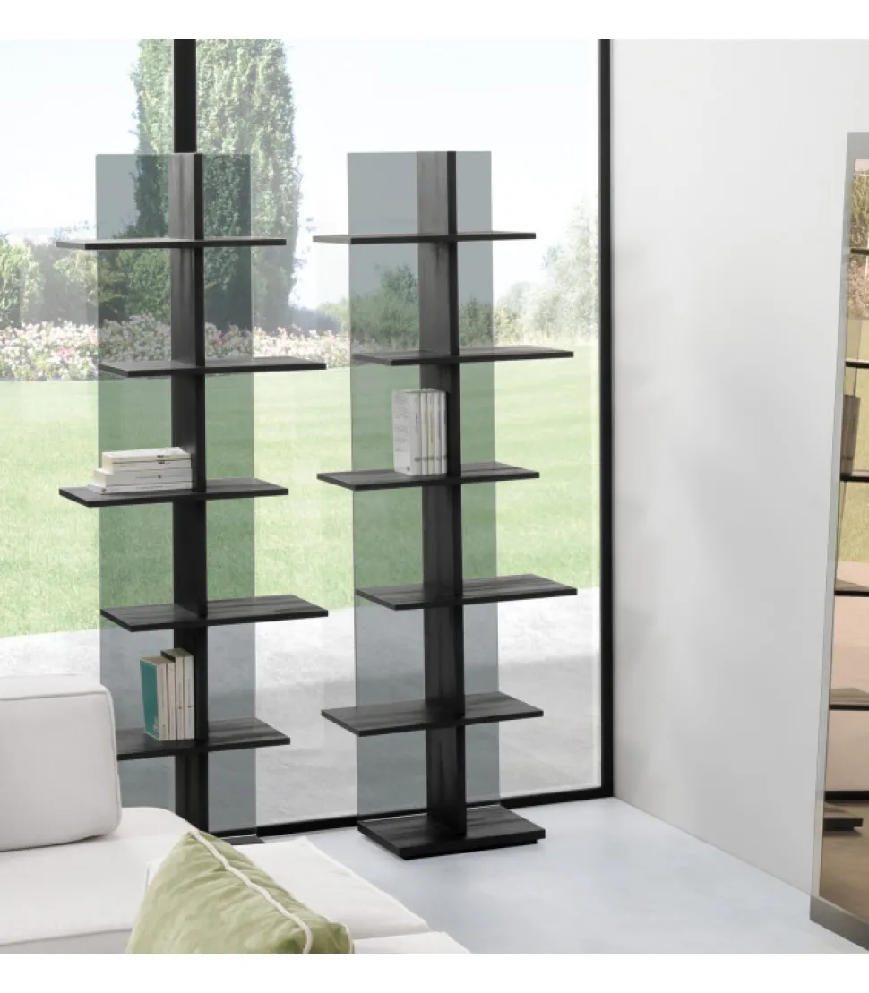 Libreria Di Grande Effetto Decorativo Con Struttura In Laminato Ecologico Spessore Mm 18-25, Schienale In Vetro Trasparente Temperato Mm 10 Ed Elementi Di Fissaggio Con Finitura Alluminio.
