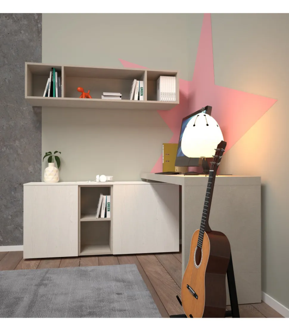 Composizione Scrivania Ad Angolo Composta Da Due Moduli Con Anta, Un Modulo A Terra Con Libreria E Una Libreria Appesa.