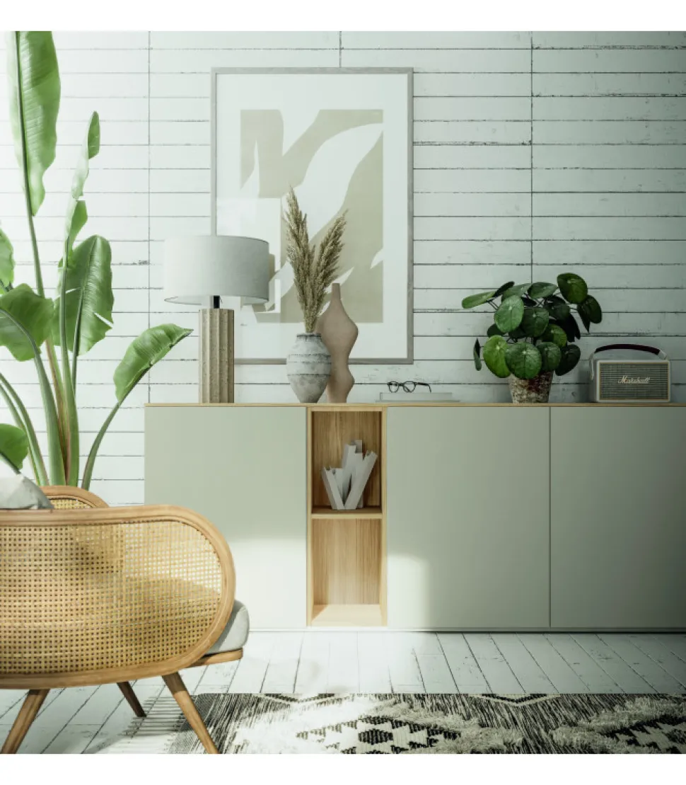 Madia Componibile Composta Da Tre Moduli Con Anta, Molto Contenitivi E Un Vano A Giorno, Creando Un Effetto Di Pieni E Vuoti Che Rendono Leggero Il Design Del Complemento.