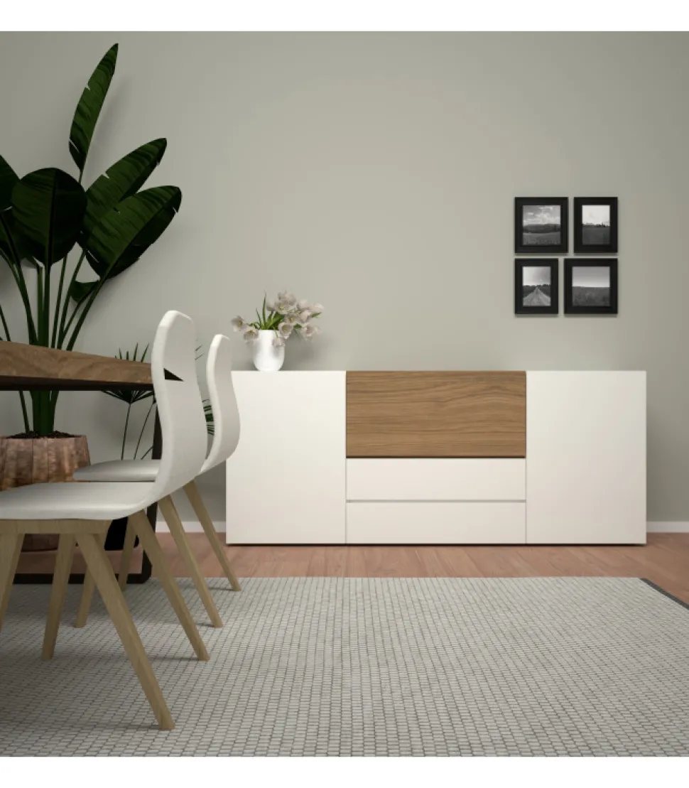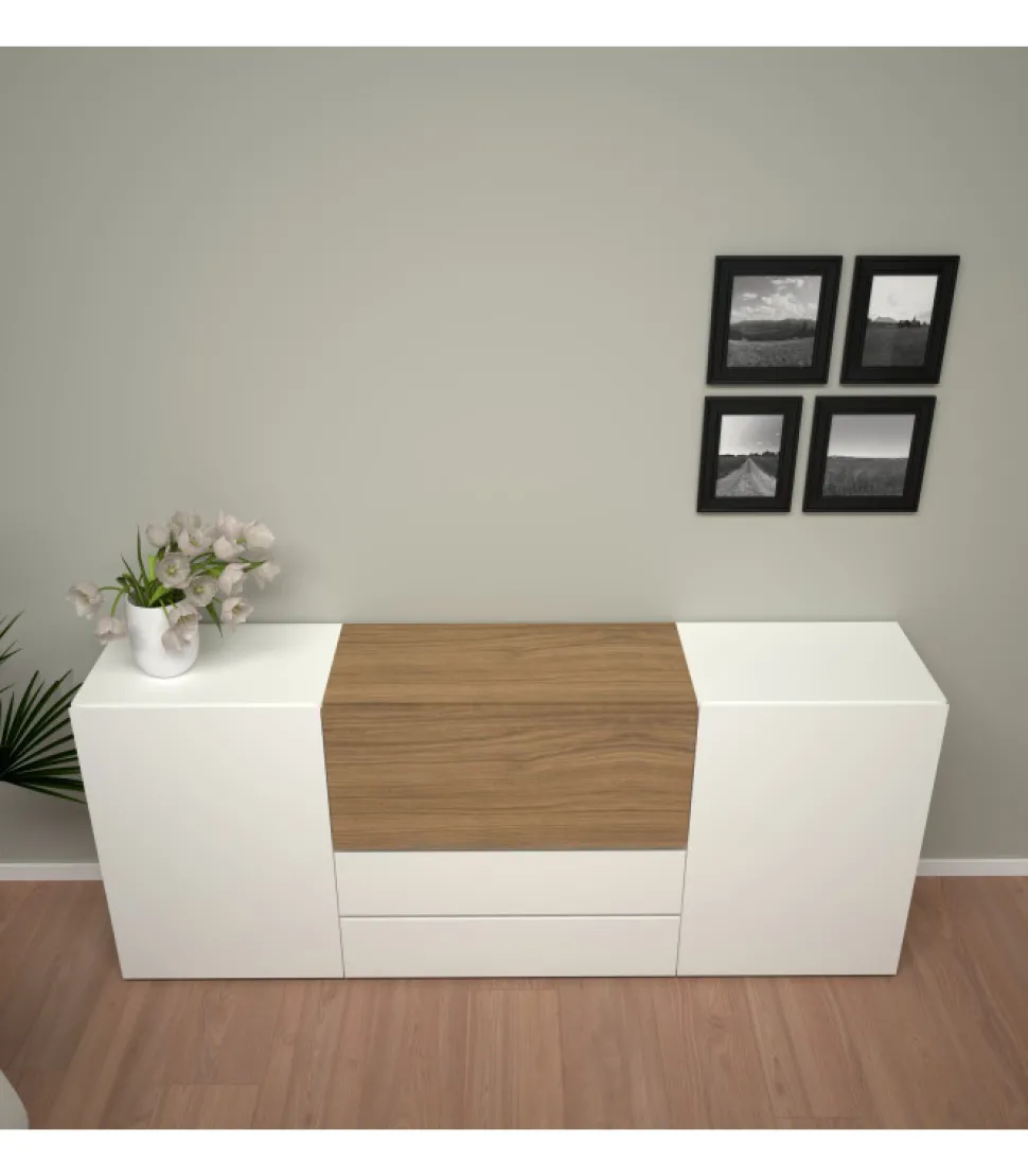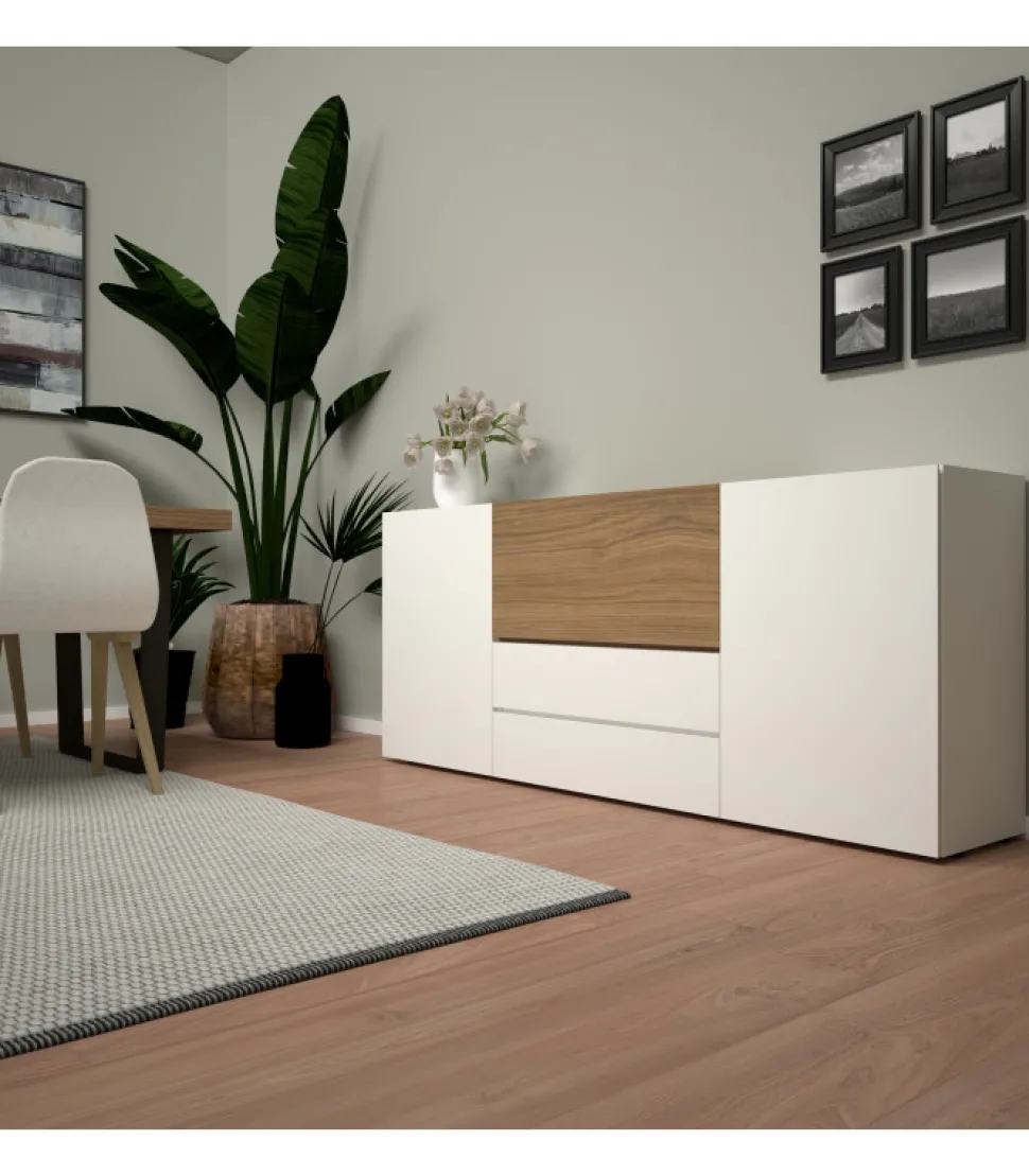 Madia Dal Design Moderno E Lineare . La Scocca Di Ogni Singolo Elemento E Realizzata In Folding. Le Ante Dei Cassetti E Delle Ante Sono Percorse In Tutto Il Suo Perimetro Da Una Fresatura Che Ne Facilita L’Apertura.