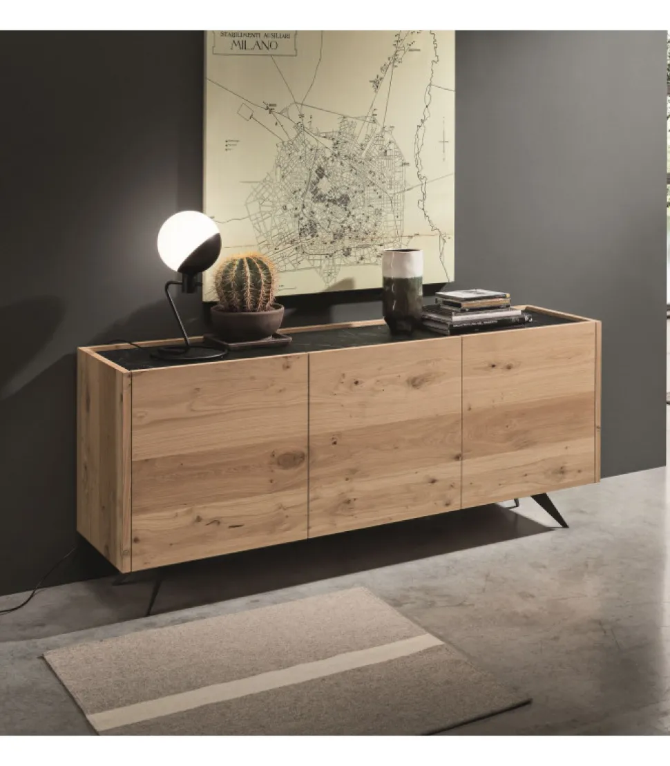 Madia Con Tre Ante, Con Presa Maniglia Dalla Parte Superiore Del Frontale. E In Rovere, Disponibile In Quattro Colori Differenti, Il Piano E Disponibile Solo In Melaminico Nero Marquinia. Struttura Interna In Finitura Melaminico Nero. Madia Montata (Smontabile). Si Consiglia L’Ancoraggio A Muro.