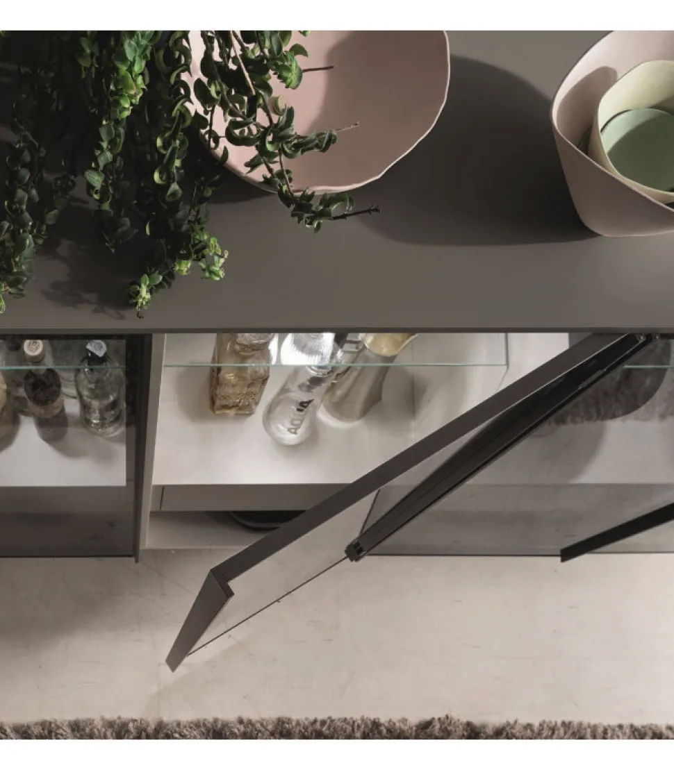 Madia Con 4 Ante In Vetro E 12 Ripiani Interni In Vetro Spessi 6 Millimetri. Apertura Di Serie Push Pull. Ante Frame Con Maniglia Integrata. Il Top E La Struttura Sono Disponibili In Melaminico, In Frassino Colorato, In Laccato Opaco, In Laccato Lucido E In Rovere Impiallacciato. La Struttura Interna Nella Versione Laccata Opaca/Lucida Sara In Melaminico Ghiaccio. Si Consiglia L’Ancoraggio A Muro.