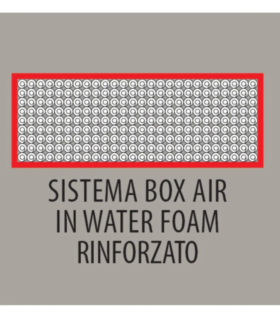 Il Sistema Box Air E Una Struttura Perimetrale In Water Foam Ad Alta Densita, Di Larghezza Variabile, Che Contiene Il Molleggio. Box Air Garantisce Robustezza E Indeformabilita Al Materasso, Mantenendo Le Caratteristiche Di Sostegno Anche Quando Ci Si Siede Sul Bordo Del Materasso.