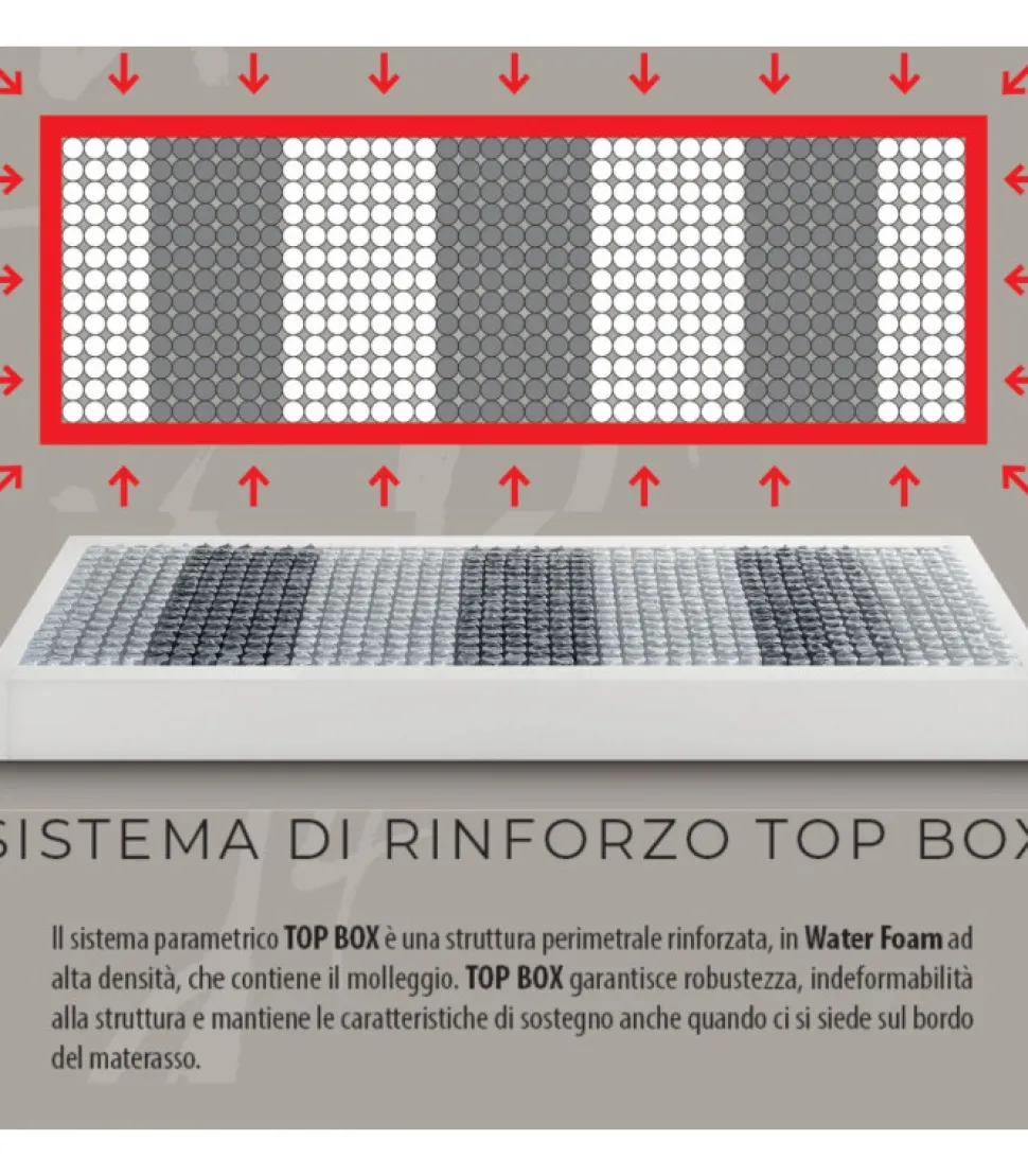 Il Sistema Parametrico Top Box E Una Struttura Perimetrale, Rinforzata In Water Foam Ad Alta Densita, Che Contiene Il Molleggio. Top Box Garantisce Robustezza, Indeformabilita Alla Struttura E Mantiene Le Caratteristiche Di Sostegno Anche Quando Ci Si Siede Sul Bordo Del Materasso.