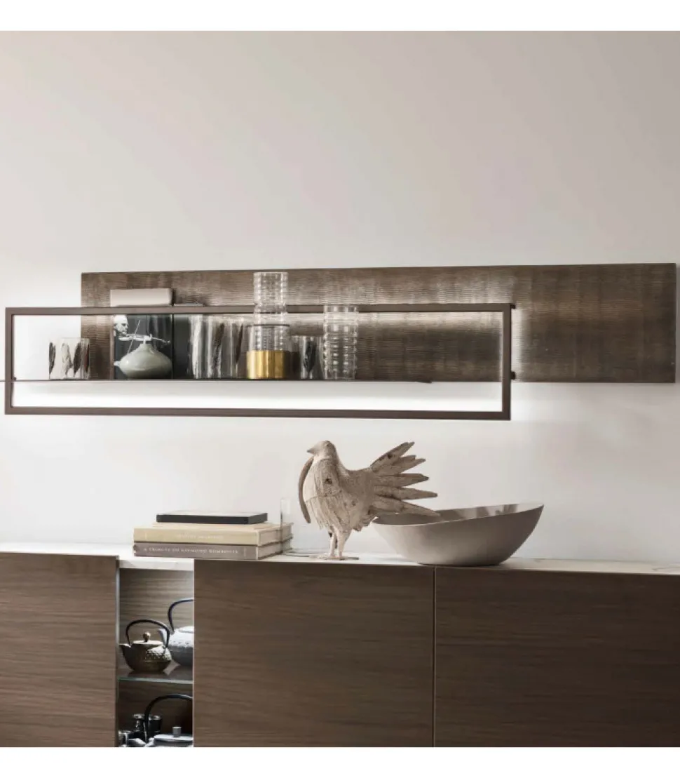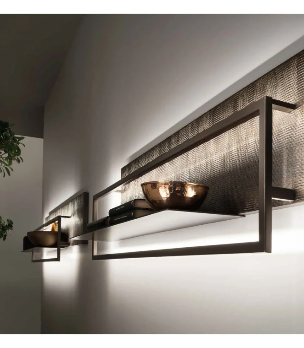 Una Mensola Formata Da Un Piano Di Appoggio, Una Cornice Decorativa In Metallo E Uno Schienale Personalizzabile In Diverse Finiture E Piu Colori. La Luce Integrata Mette Ulteriormente In Risalto Il Design.