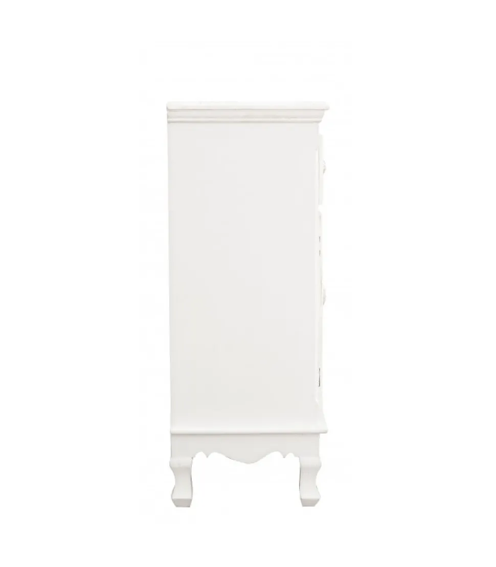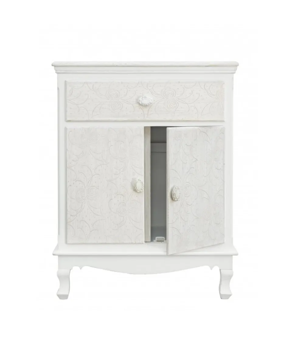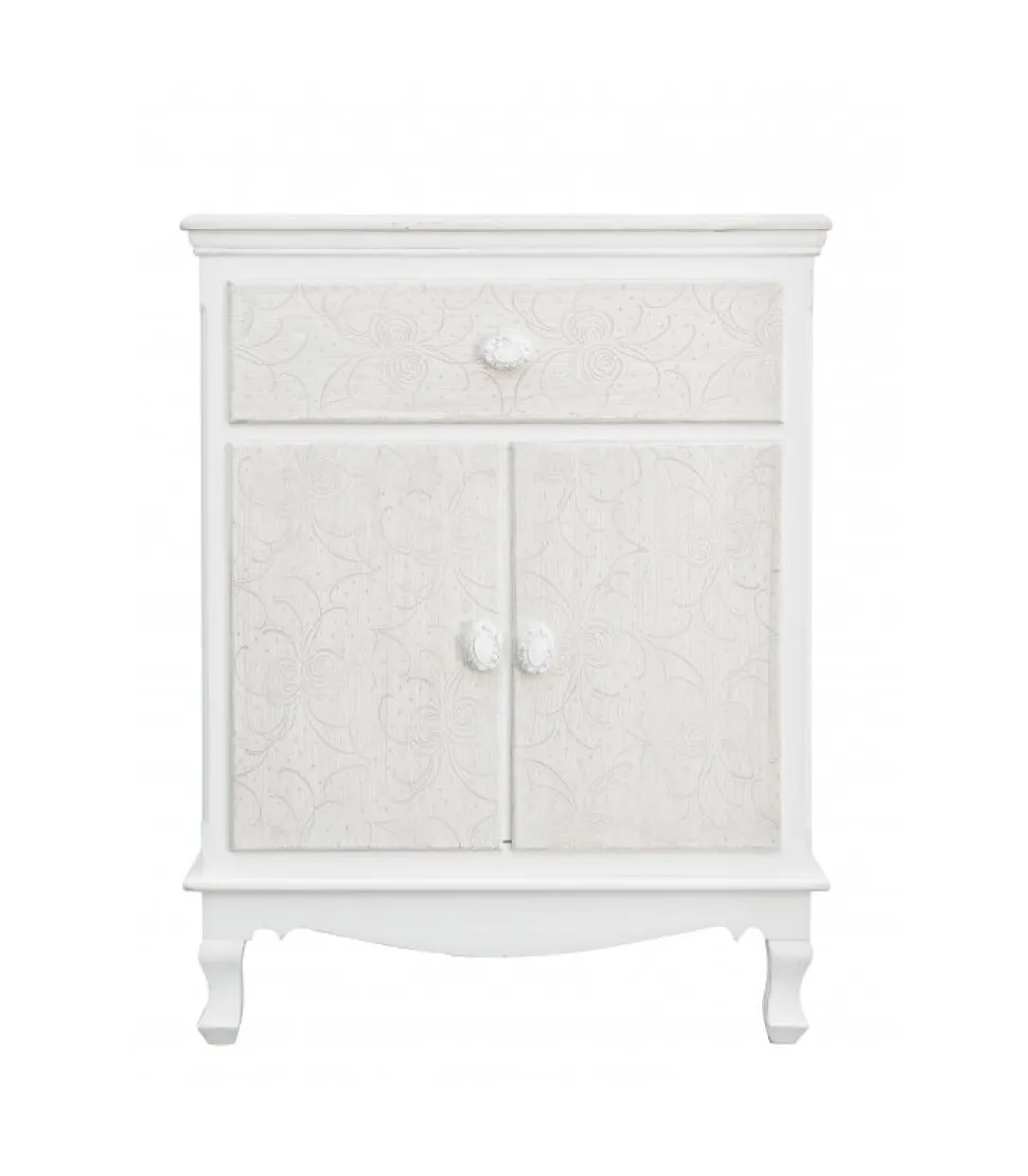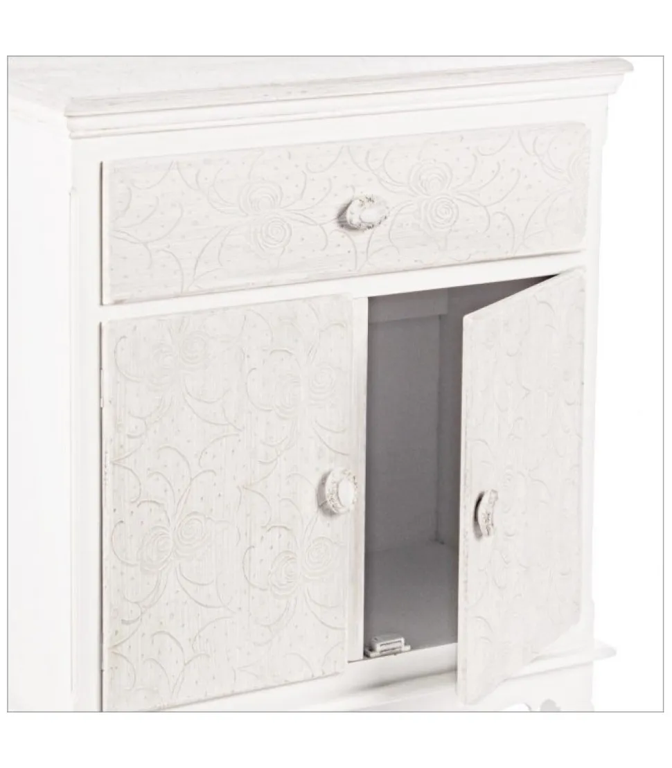 Struttura In Mdf. Ripiani E Frontali Con Motivi Floreali Intarsiati. Rifinitura Con Vernice Opaca A Base D’Acqua. Maniglie In Poliresina.