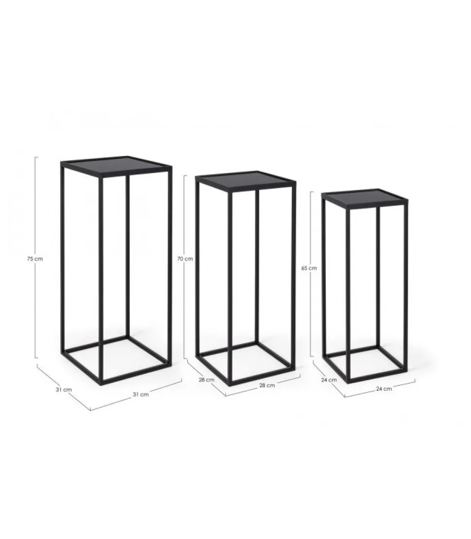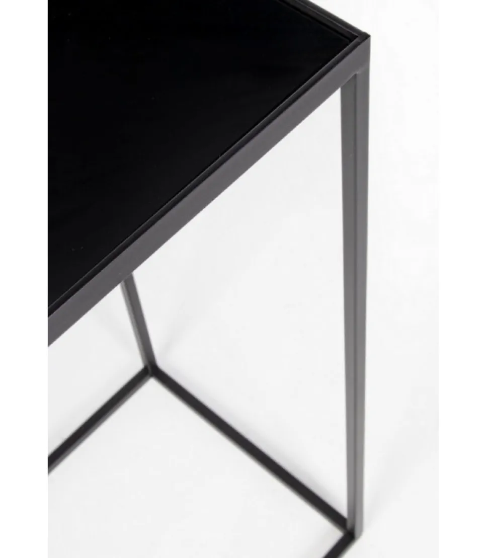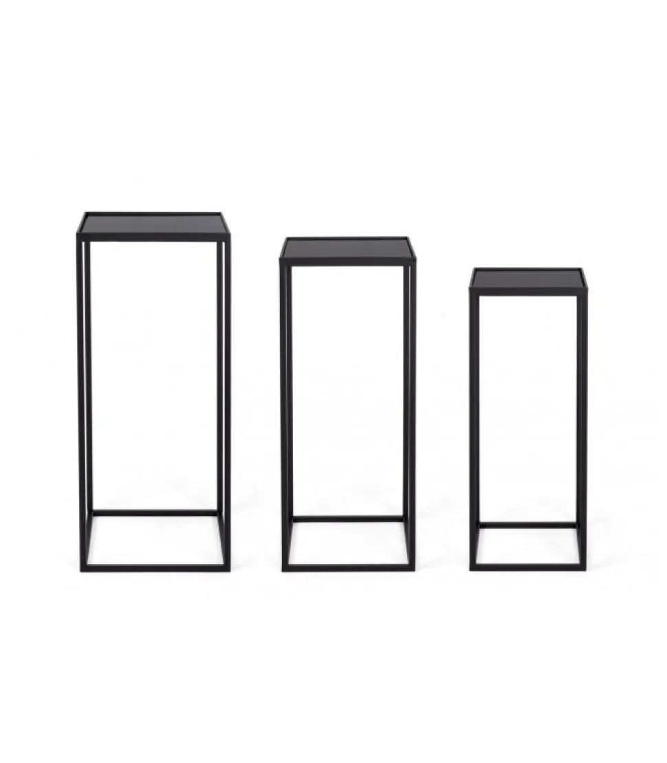 Set3 Tavolino Nucleos Qu Nero Acciaio Verniciato A Polvere Epossidica. Piano Con Vetro Colorato. – Dimensioni In Cm. 24 (L.) 24 (P.) 65 H; 28 (L.) 28 (P.) 70 H; 31 (L.) 31 (P.) 75 H