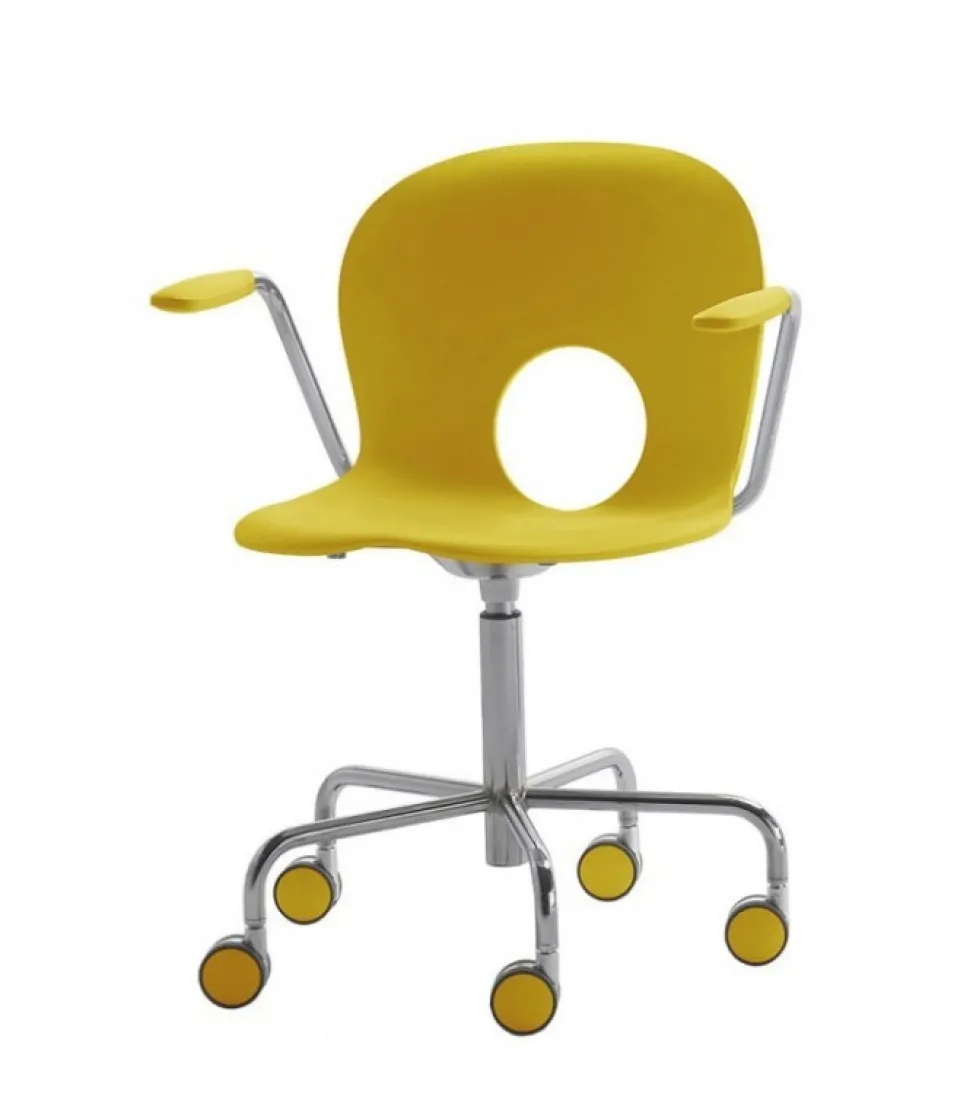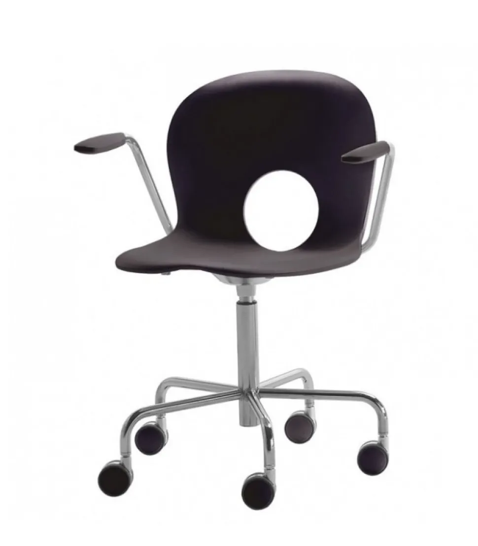 Poltroncina Girevole Su Ruote, Altezza Fissa Olivia Icona Rexite, Inconfondibile Per La Linea Morbida E Il Foro Perfettamente Circolare Nello Schienale, In Questa Versione Su Ruote E Perfetta Sia Per Aree Operative Che Per Home Office.