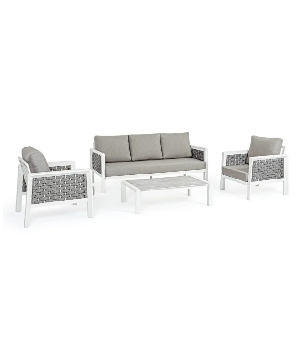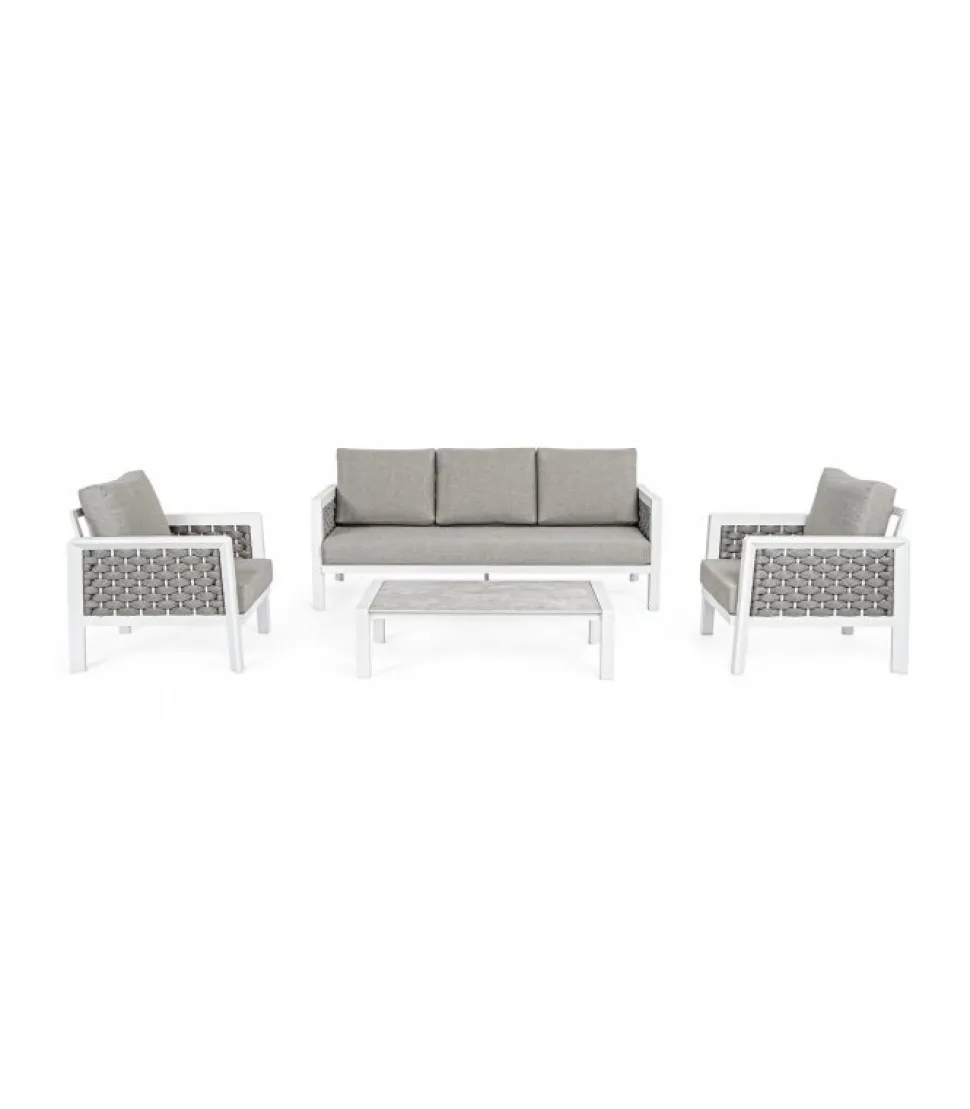 Set4 Salotto C-C Otavio Bianco Wg20 Struttura In Alluminio Verniciato A Polvere (Poliestere). Intreccio Con Corde In Tetoron (100% Poliestere) Con Imbottitura In Gomma (Polietilene). Cuscini Seduta E Schienale Sfoderabili Con Tessuto Olefin (100% Polipropilene). Tavolino Con Piano In Ceramica. Da Assemblare. – Dimensioni In Cm. A 77 (L.) 86 (P.) 78 H – 39 ( H1) 66 H2 / B 207 (L.) 86 (P.) 78 H – 39 ( H1) 66 H2/ C 120 (L.) 65 (P.) 33 H