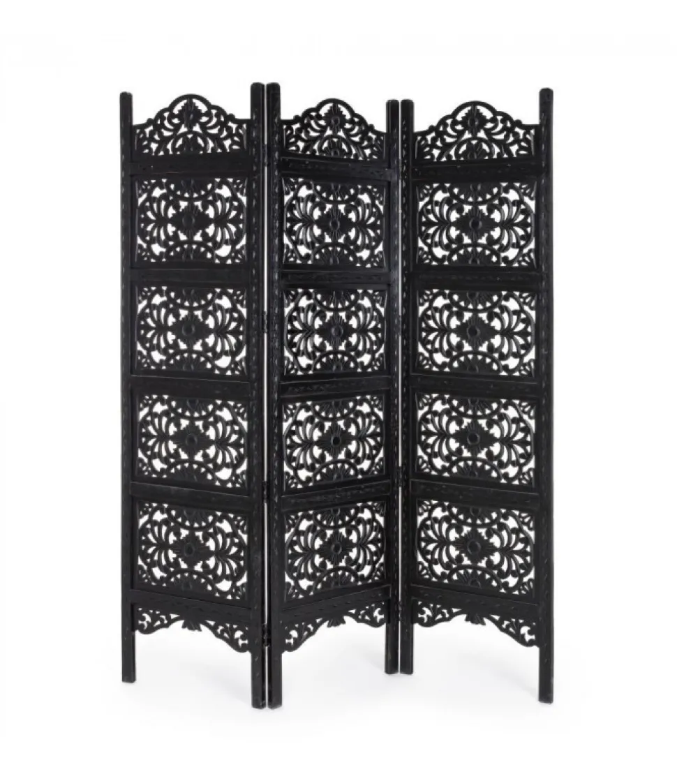 Paravento 3A Kiran Nero Anticato Struttura In Legno Di Mango E Mdf. Lavorata Ed Intarsiata A Mano, Finitura A Base D’Acqua, Decapata Ed Anticata.