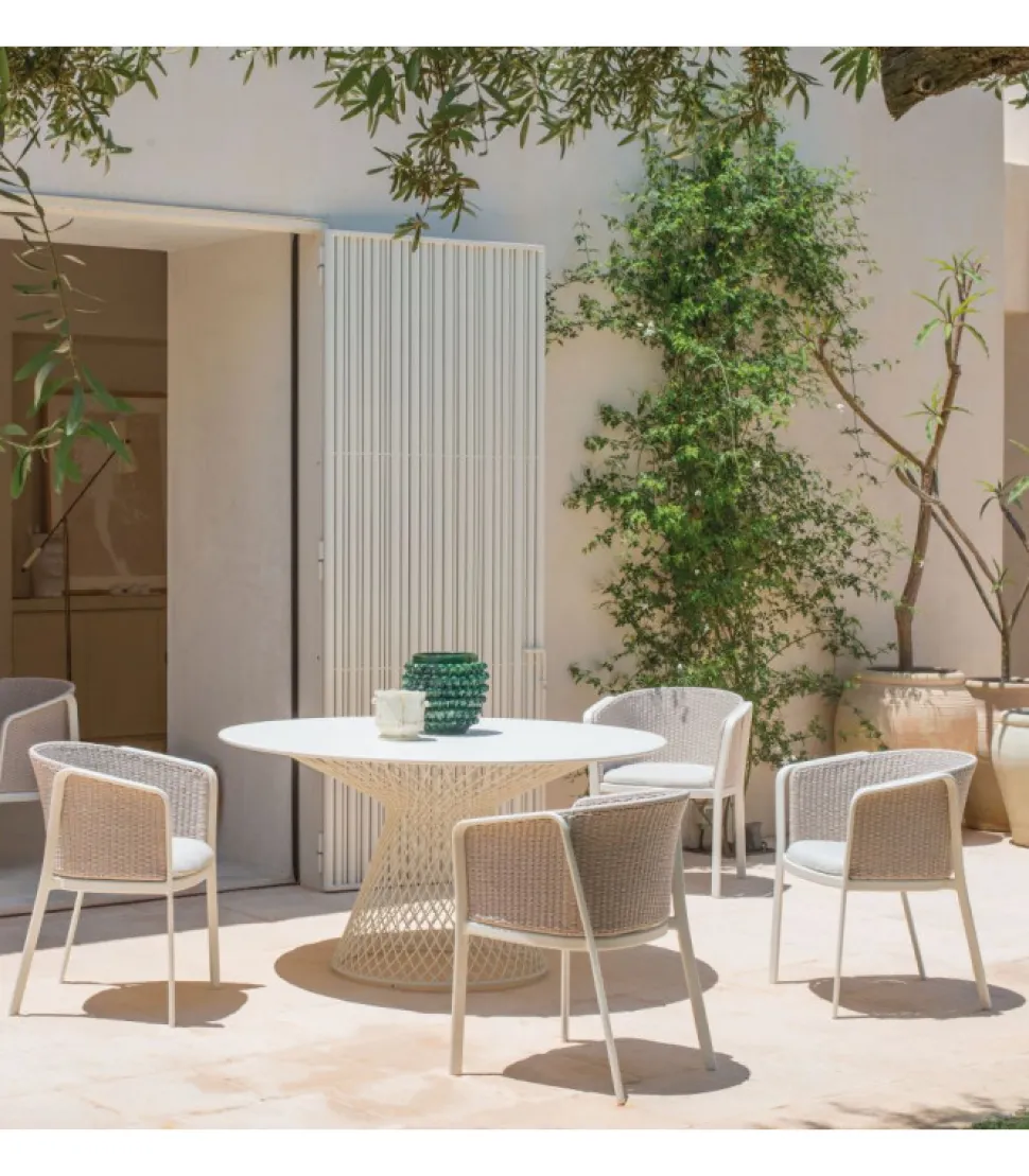 La Collezione Carousel Si Compone Di Quattro Versioni Di Poltroncina Dining, Tre Versioni Di Poltrona Lounge, Divano, Pouf, Coffee Table Quadrato E Rettangolare. Nelle Sedute, La Struttura A Cavalletto E In Tubolare Di Alluminio. Il Sedile, Costituito Da Una Lamiera In Lega Di Alluminio Che Viene Imbutita Per Conferire Una Forma Pulita, E Successivamente Fissato Alla Struttura Di Alluminio Attraverso Una Saldatura Di Tipo Strutturale, Eseguita Con Tecnologia Tig Che Conferisce Particolare Resistenza Oltre Che Un Miglior Standard A Livello Estetico. La Struttura Dello Schienale E In Acciaio Ed E Il Supporto Su Cui Sono Realizzati Gli Intrecci Decorativi Nei Vari Materiali Proposti. Tutti I Materiali Selezionati Garantiscono Una Resistenza E Una Stabilita Del Colore. Per La Poltroncina Dining E Prevista Una Versione In Tessuto Tecnico Quale Propilene In Fibra Fiber Fill, Con Cui Viene Realizzato Un Cuscino Sedile E Uno Schienale Autoportante. Questi Materiali Garantiscono Idrorepellenza, Per Questo Il Prodotto E Particolarmente Idoneo In Tutti Gli Usi Di Ambienti Marini E In Condizioni Climatiche Estreme. I Pouf Hanno Una Struttura In Tubolare Ovale Di Alluminio Mentre I Tavoli Hanno Una Struttura In Tondino Di Acciaio Con Piano In Lega Di Alluminio E Sottopiedi Regolabili In Nylon E Vite Inox. Tutti Decorati Con Intreccio Di Corda.