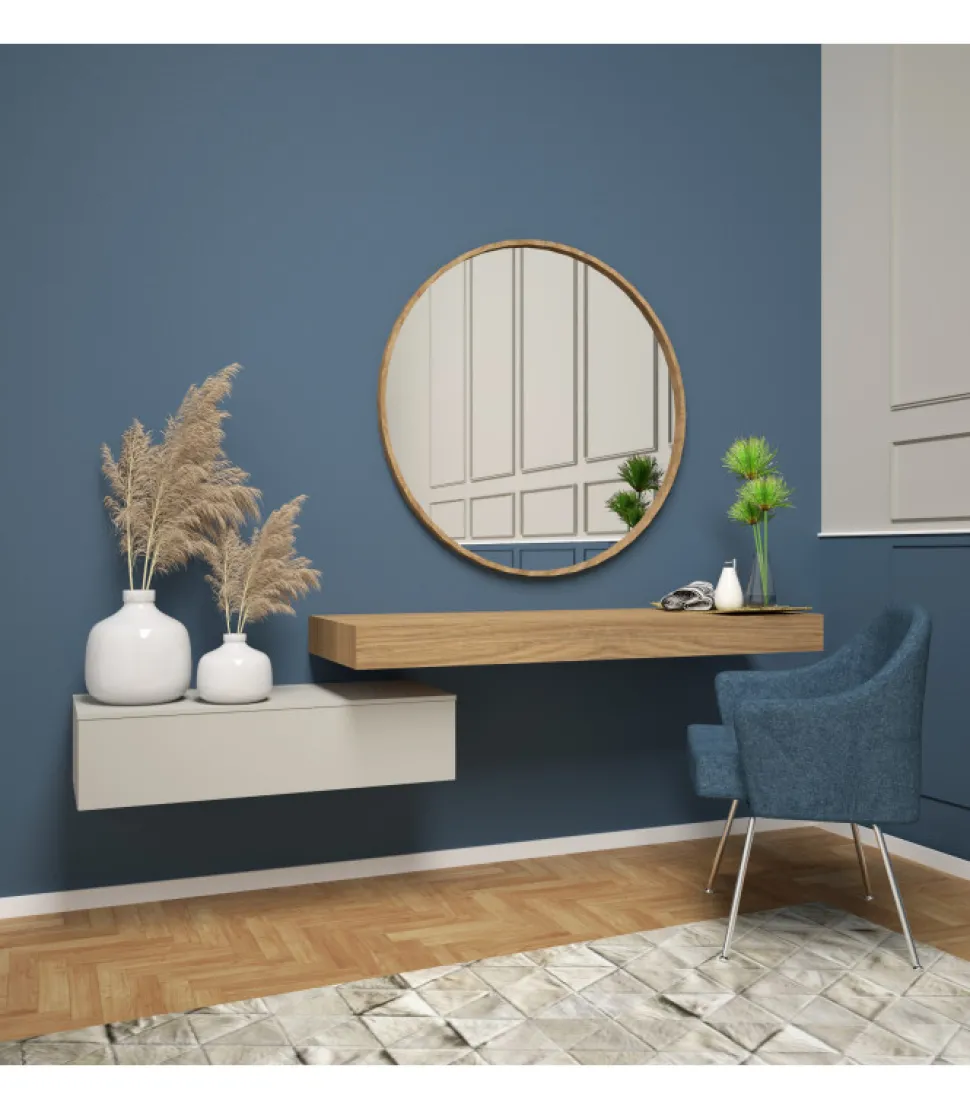 Moderna Postazione Trucco Realizzata Con Una Panca Sospesa, Un Capiente Cassetto Sospeso E Una Specchiera Rotonda.