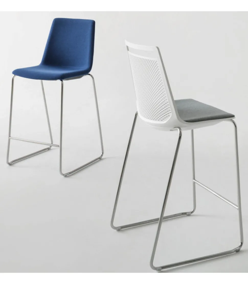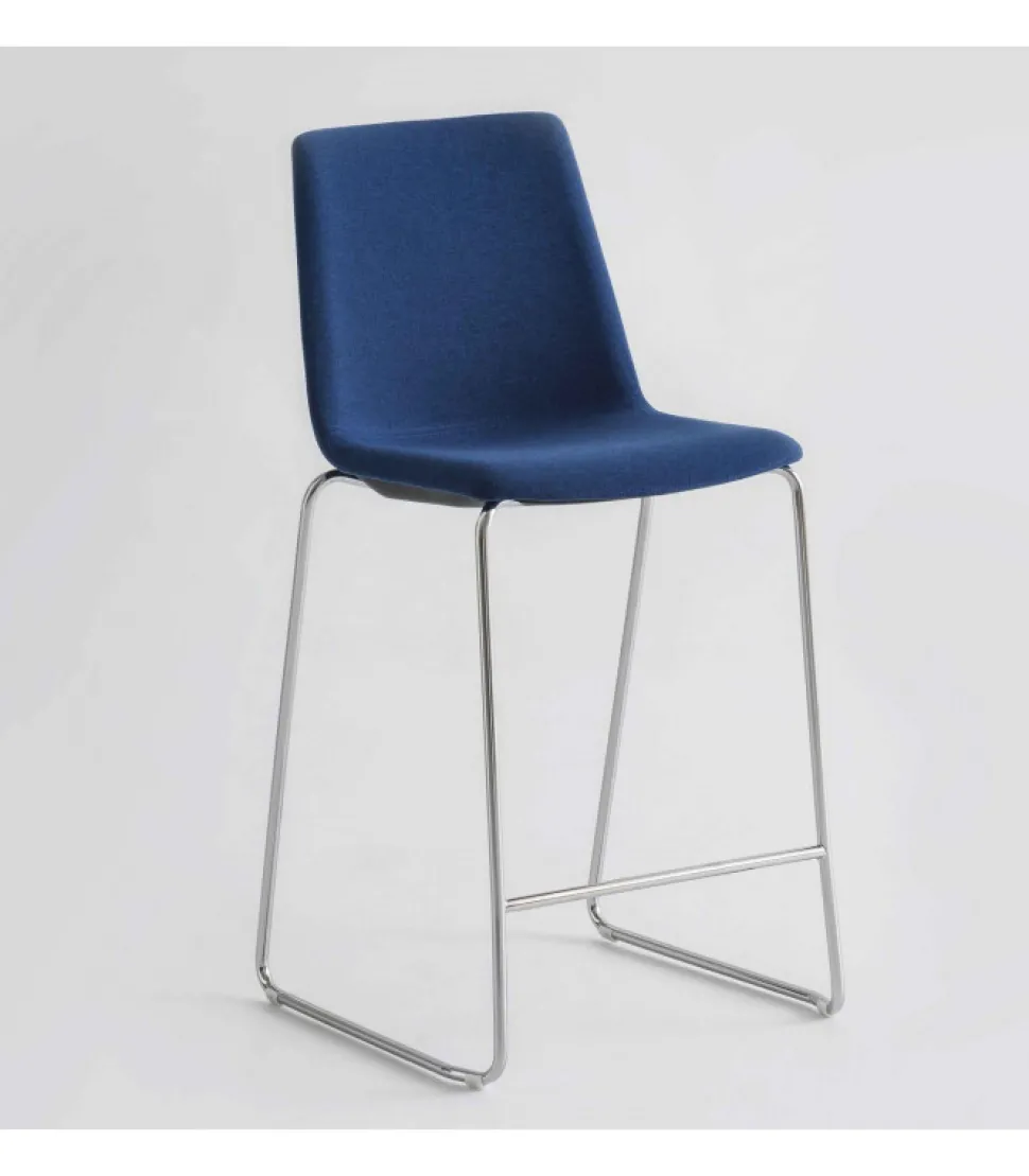 Sgabello Akami Stu Disponibile In Due Dimensioni. La Scocca E Imbottita In Pu-Flex E Rivestita (Disponibili 3 Tessuti), La Struttura E A Slitta In Metallo Cromato O Verniciato Di Bianco O Di Nero, Ed E Dotata Di Appoggiapiedi.
