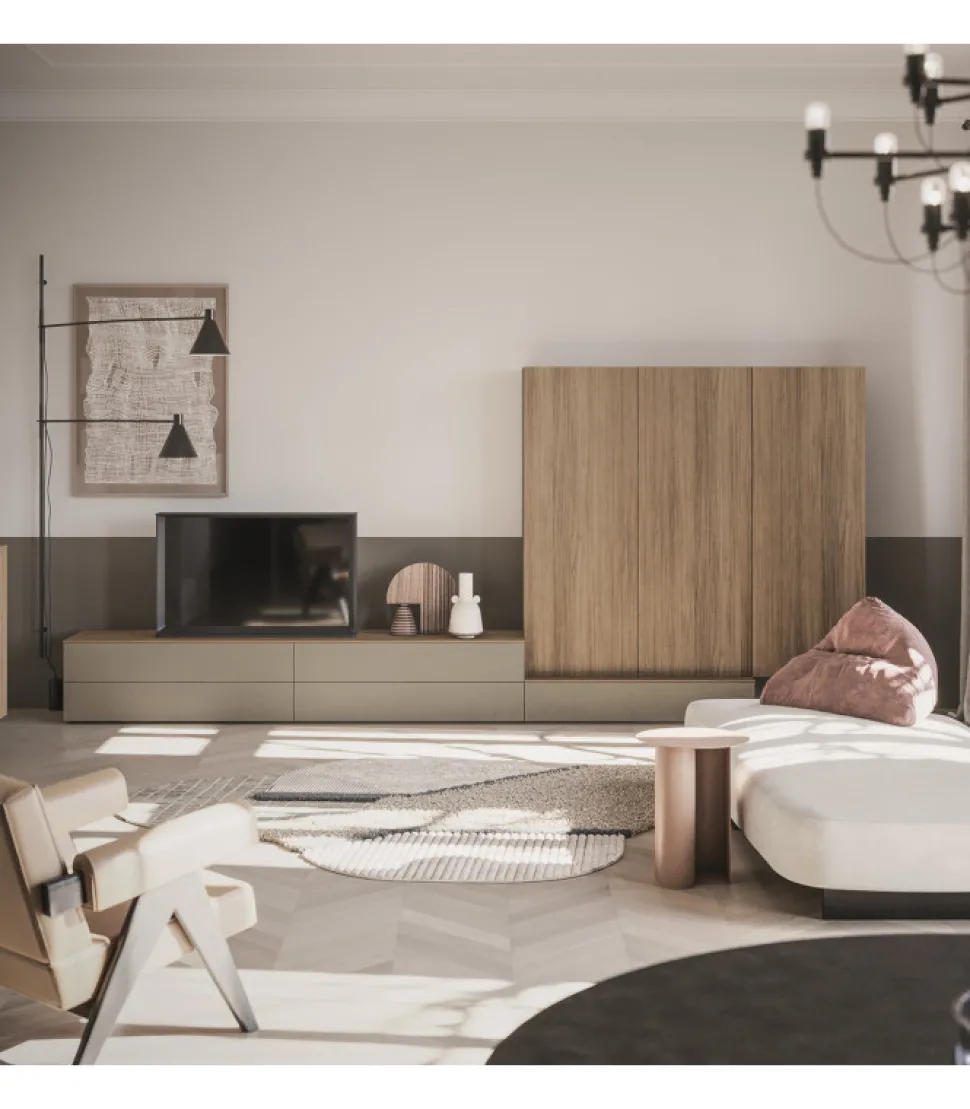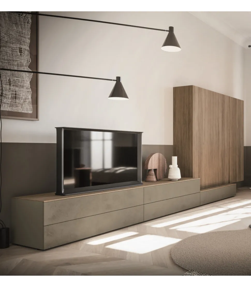 Il Soggiorno E Al Giorno D’Oggi Un Ambiente Ibrido. Non Solo Luogo Di Relax E Convivialita, Viene Sempre Piu Spesso Destinato Anche A Spazio Di Lavoro. Diventa Quindi Necessario Che I Mobili Per La Zona Giorno Uniscano Alla Funzione Contenitiva Un Design Sobrio Ed Elegante. Nella Composizione Proposta In Queste Pagine La Nuova Essenza Matwood Coffee E Stata Abbinata Alla Finitura Concrete Maggese, Per Donare Alle Superfici Un Aspetto Piu Materico E Naturale.
