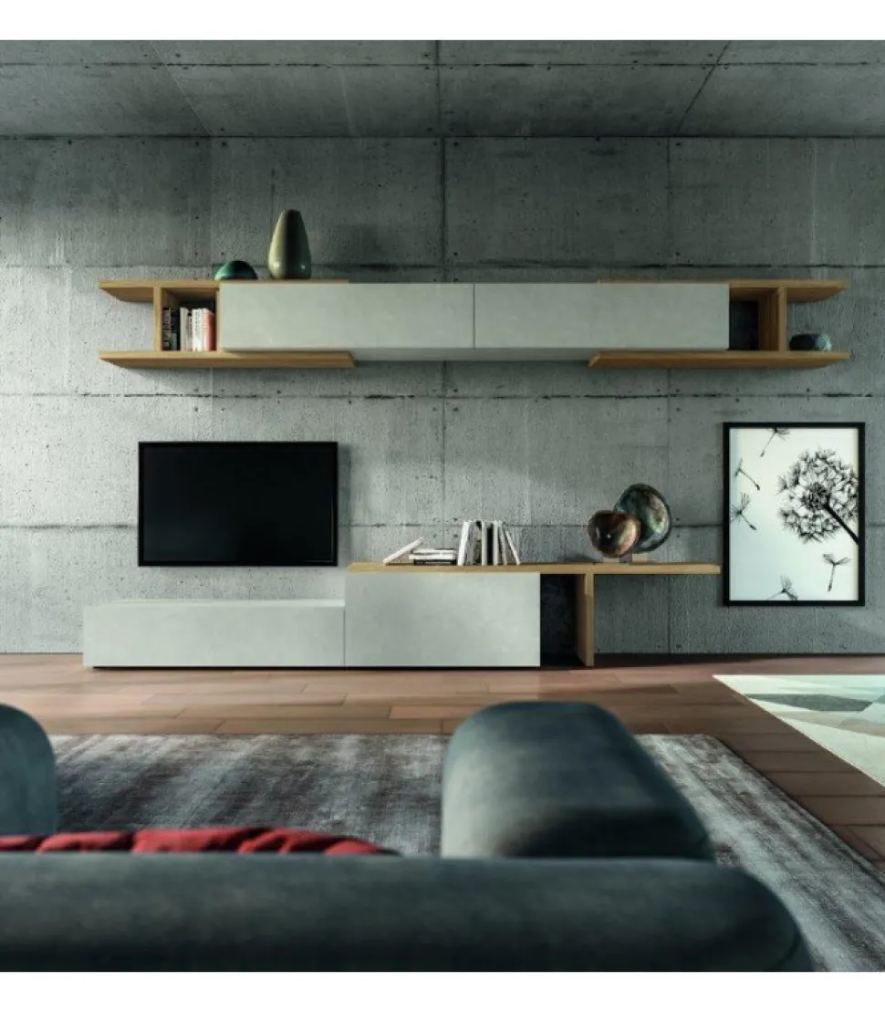 La Mensola In Essenza Abbraccia Il Pensile Orizzontale Nella Finitura Calce, Dando Vita A Un Effetto Complessivo Armonioso. Vivere Il Soggiorno Diventa Un’Esperienza Rilassante Capace Di Stimolare Riflessioni Profonde.