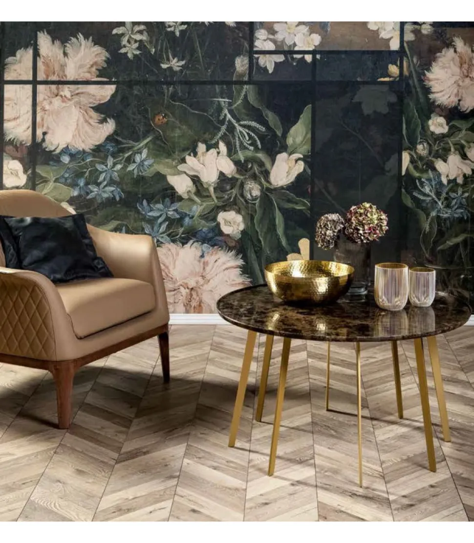 Tavolino Realizzato Con I Marmi Piu Preziosi Che Creano Ripiani Incavati Come Fossero Dei Vassoi, E Una Base Laccata In Oro Opaco.