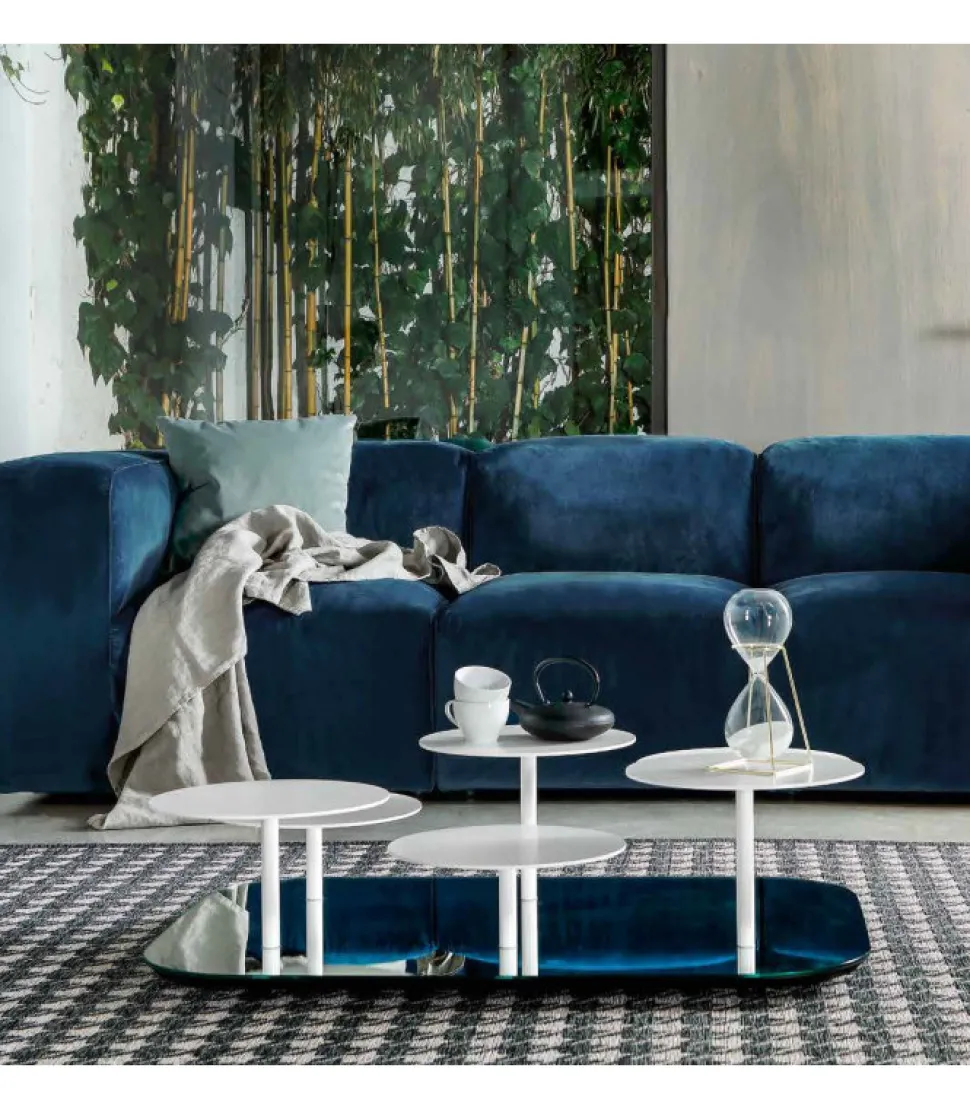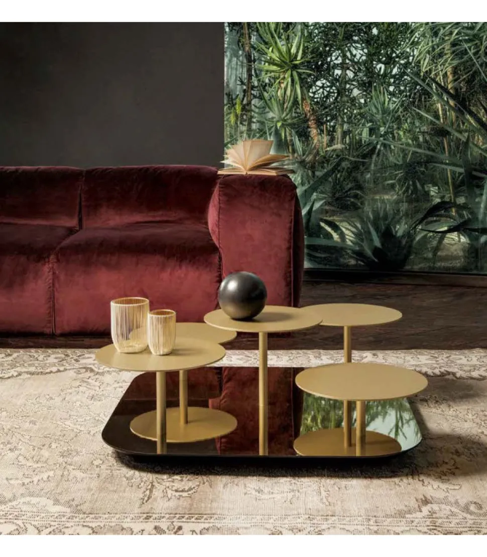 Tavolino Quadrato O Rettangolare Con Base In Finitura Specchio E Piani In Metallo Verniciato. E Disponibile In Due Diverse Dimensioni Con Quantitativo Di Pian Diverso.