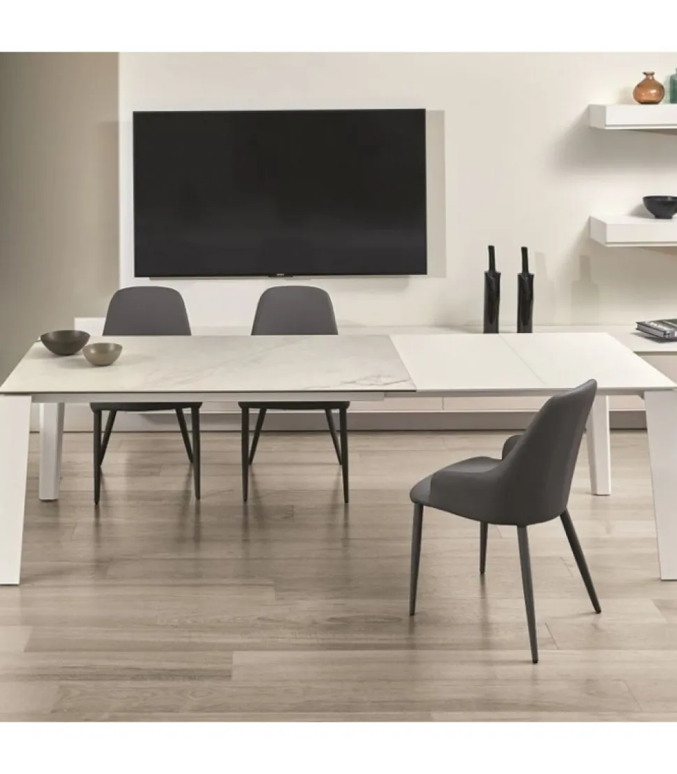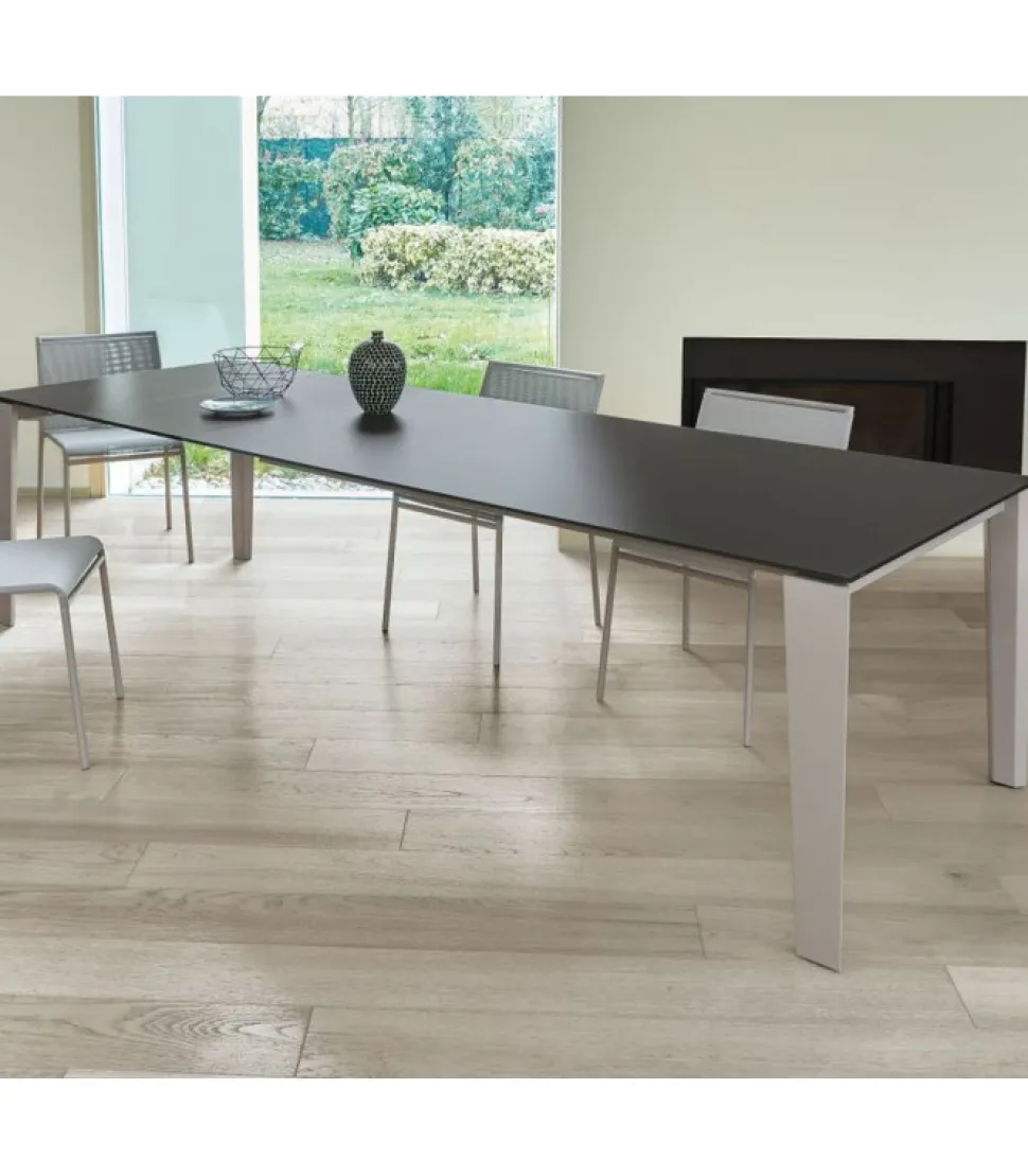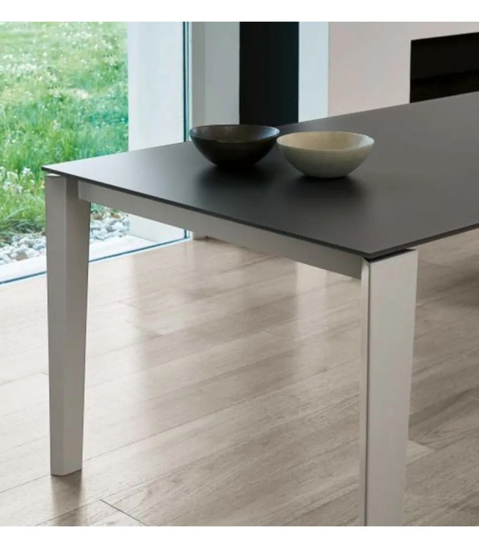 Tavolo Allungabile Winny. Struttura In Acciaio Laccato Alluminio. Piano In Cristallo Laccato Lucido, Cristallo Velvet Antigraffio Opaco, Melaminico, Legno Impiallacciato, Superceramica E Supermarmo.