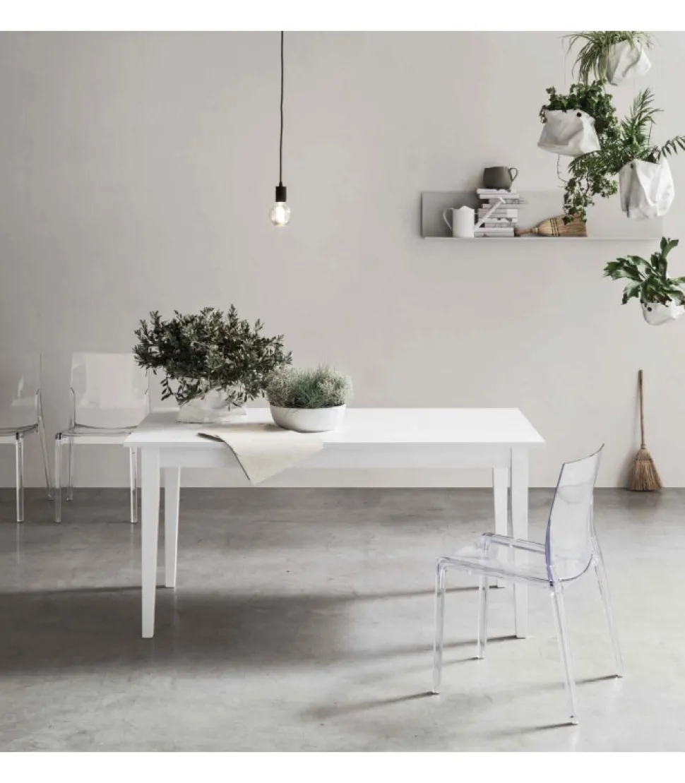 Tavolo Con Piano Rettangolare Allungabile, Con Allunga Laterale Da 40 Centimetri. E Disponibile In Melaminico, In Frassino Colorato O Laccato Opaco, E Spesso 22 Millimetri. La Struttura, Formata Da Quattro Gambe, E Disponibile In Frassino Colorato E Laccata Opaca. E Disponibile In Due Dimensioni.