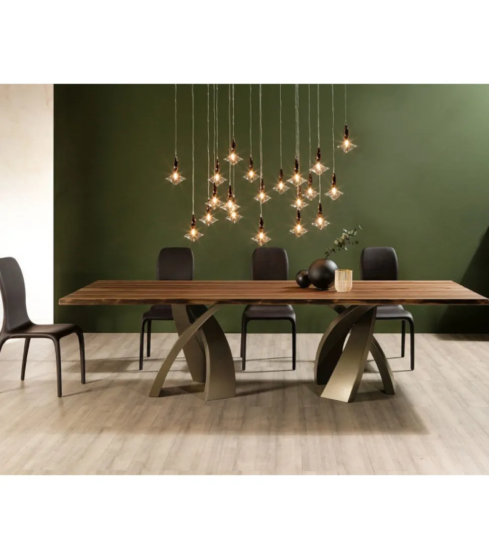 Un Rettangolo Di Gres Porcellanato In Diverse Finiture, O Di Vetro Temperato Elettro-Saldato A Raggi Uv Su Di Una Piastra D’Acciaio; Il Tutto Poggiato Su Di Una Base In Metallo Curvato E Verniciato, Ad Ottenere Un Effetto Di Grande Ricercatezza Estetica. Con Eliseo, Nasce Un Tavolo Da Pranzo Di Estrema Raffinatezza, Capace Di Adattarsi A Stanze Di Diverse Dimensioni.