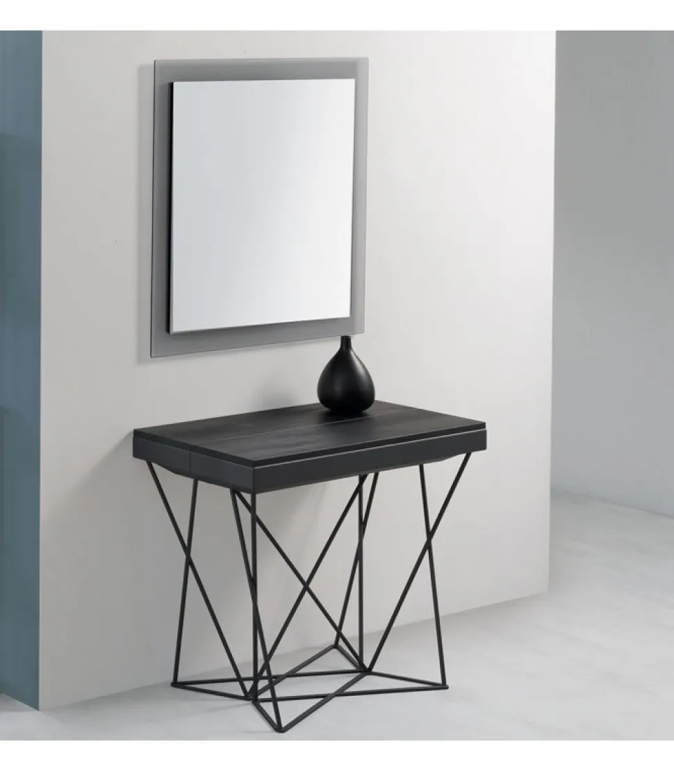 Tavolo-Consolle Allungabile Con Stuttura In Lamina D’Acciaio E Gambe In Acciaio Tondo Pieno Da 12 Mm Verniciata Con Finitura Sable. Il Top E Le 5 Allunghe In Dotazione (Da Cm 45 Cadauna) Sono Realizzati In Laminato Ecologico Spessore 18 Mm. Gambe Pieghevoli Di Supporto In Acciaio Inox E Guida Estensibile In Alluminio.