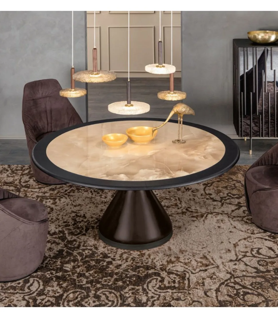 Tavolo Fisso Con Base In Agglomerato Di Marmo Laccato E Piano In Vetro O Legno Con Inserto In Gres Porcellanato. Disponibile Anche Con Vassoio Centrale Lazy Susan. Aggiungi Un Posto A Tavola Che Arriva Dolly.