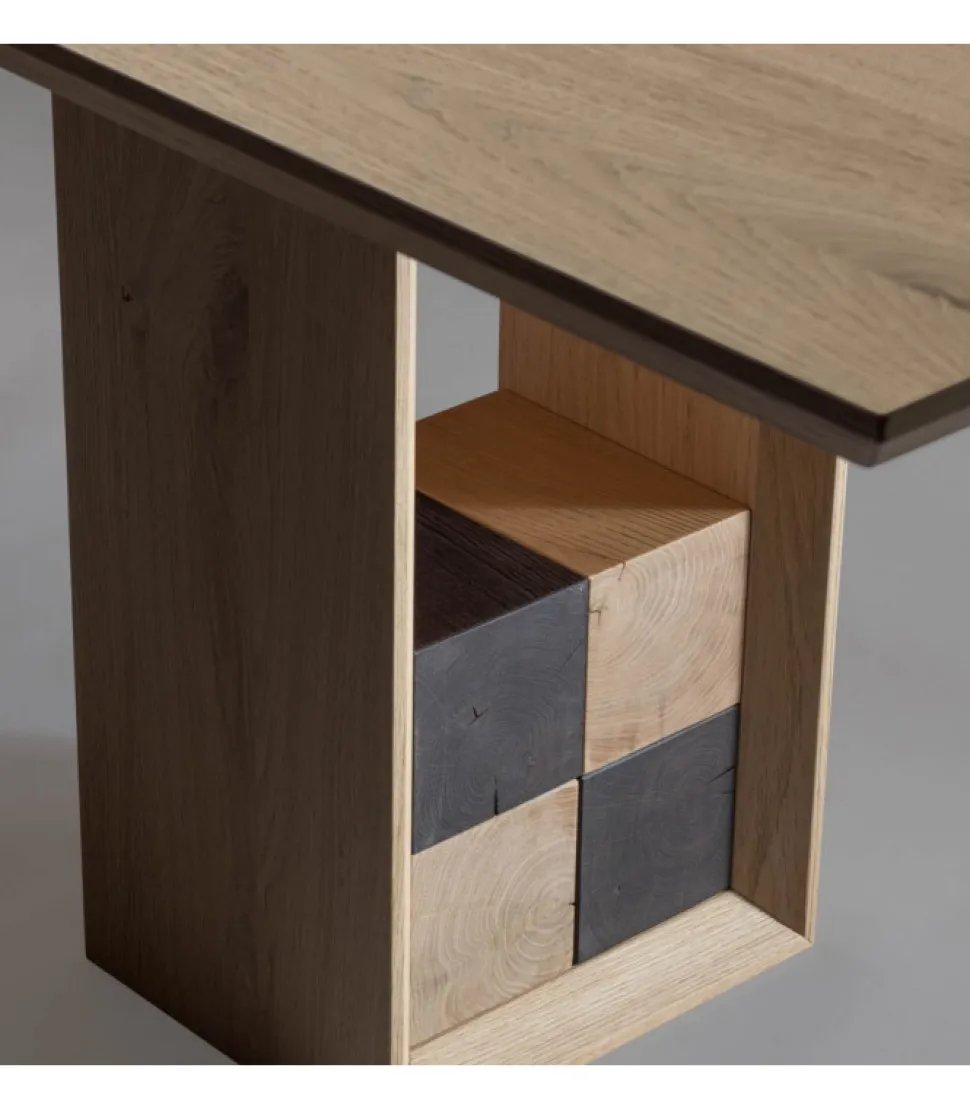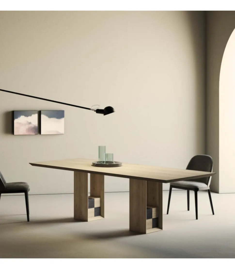 Il Basamento Del Tavolo Fill E Realizzato Con Cura Utilizzando Un Impiallacciato Bisellato E Decorato Con Quadrotti, Che Aggiungono Un Tocco Di Raffinatezza E Originalita Al Design Complessivo. Questo Basamento Conferisce Al Tavolo Una Stabilita Solida E Una Presenza Scenica Che Non Passera Inosservata.