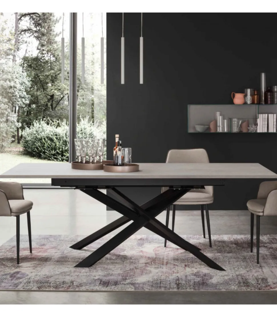 Il Basamento In Metallo Nero E L’Elemento Caratterizzante Del Tavolo. Il Piano Puo Essere Realizzato In Quattro Tonalita Di Rovere, Effetti Marmo O Cemento E Si Estende Da Un Lato Con Due Allunghe. All’Occorrenza, Le Allunghe Nascoste Sotto Il Piano Possono Essere Estratte Per Aumentare I Posti A Sedere Attorno Al Tavolo.