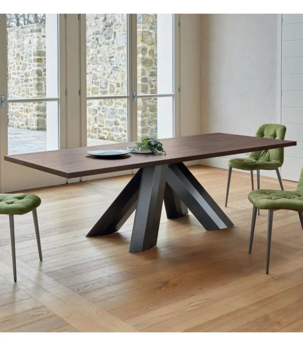 Tavolo Fisso Con Con Struttura In Acciaio Laccato E Piano Rettangolare In Legno Impiallacciato, Legno Massellato, Cristallo E Cristallo Antigraffio.