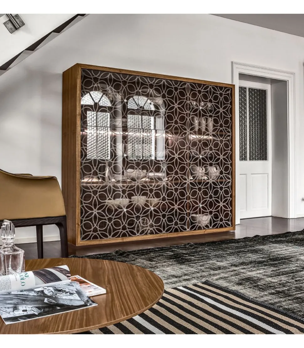 Vetrina Effetto Legno, Con Ante In Vetro Acidato O Trasparente E Pomoli In Cristallo. Ripiani In Vetro Bronzo Trasparente.