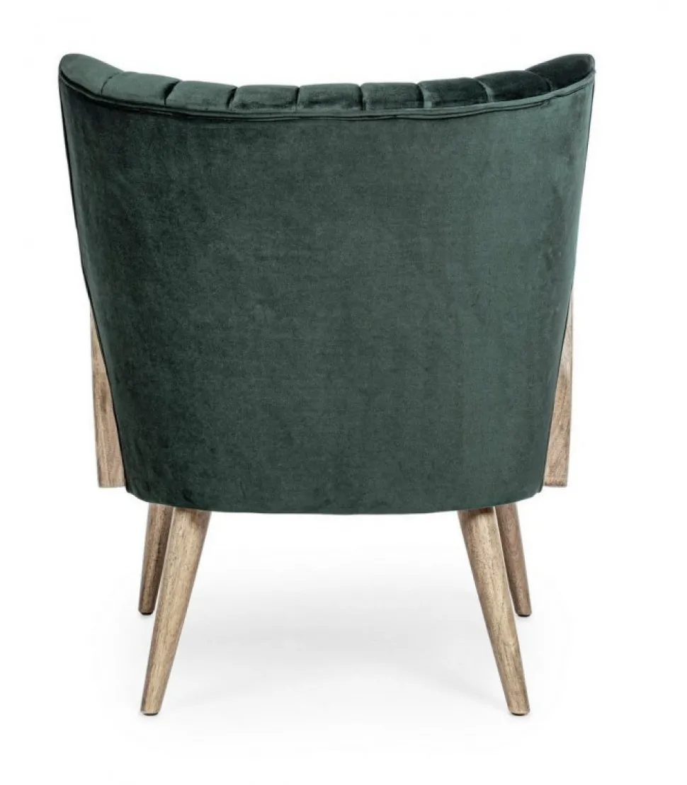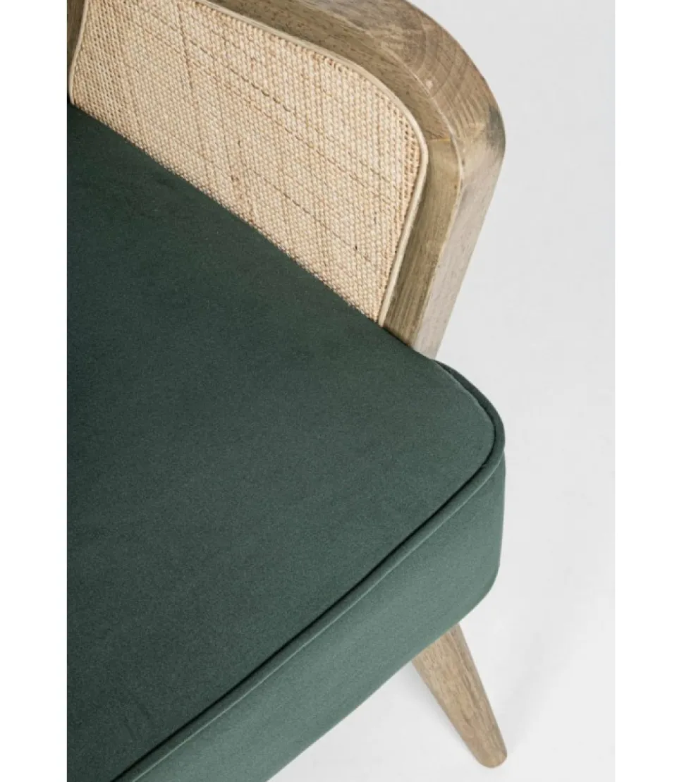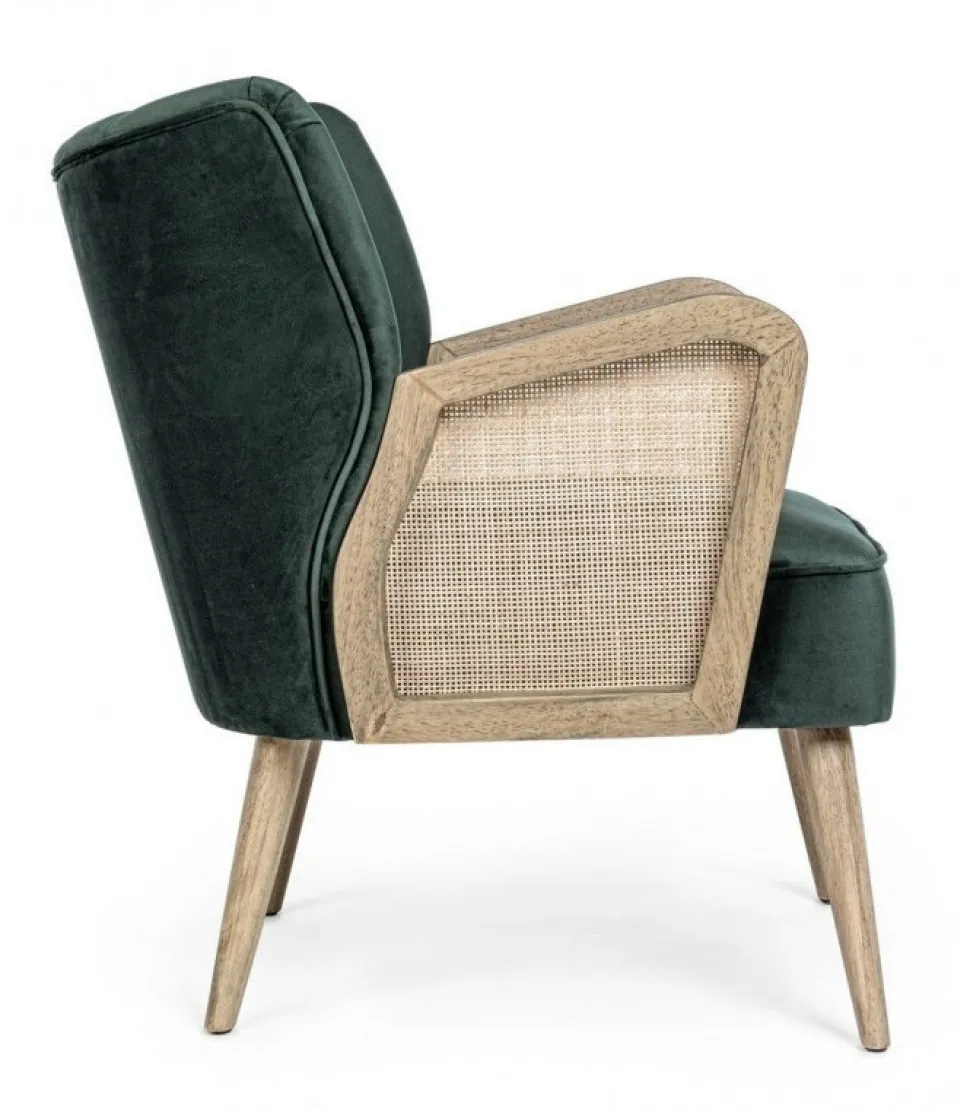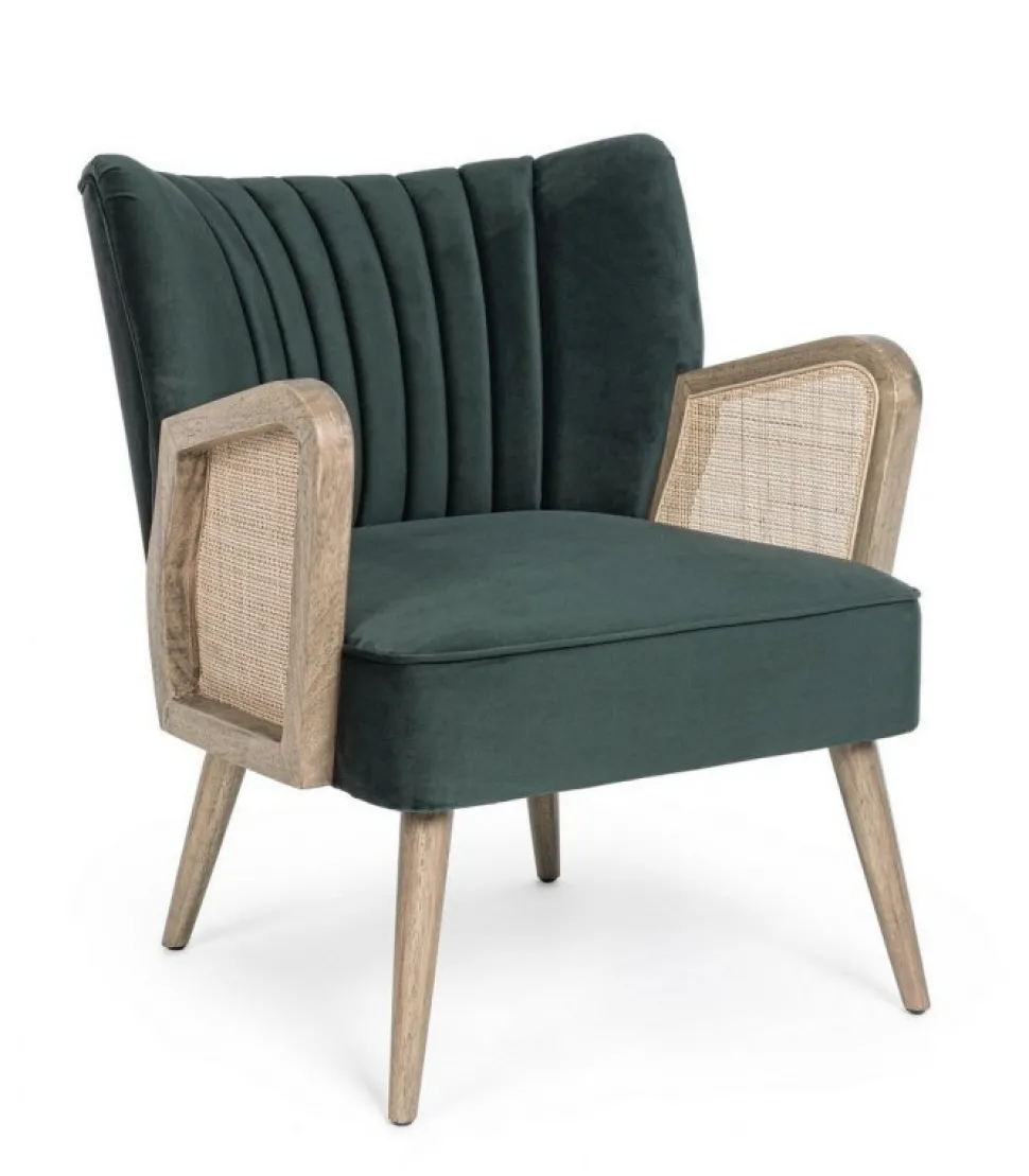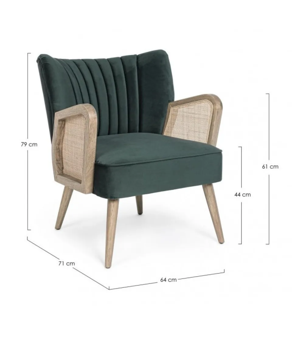 Poltrona Virna Verde Struttura In Legno Di Pino E Compensato. Gambe In Rubberwood. Braccioli Con Inserti In Rattan. Rivestimento In Poliestere Effetto Velluto. Densita’ Imbottitura In Schiuma Poliuretanica 24 Kg/M3. Non Sfoderabile. Gambe Da Assemblare. – Dimensioni In Cm. 64 (L.) 71 (P.) 79 ( H.) 44 ( H1) – 61 ( H2)