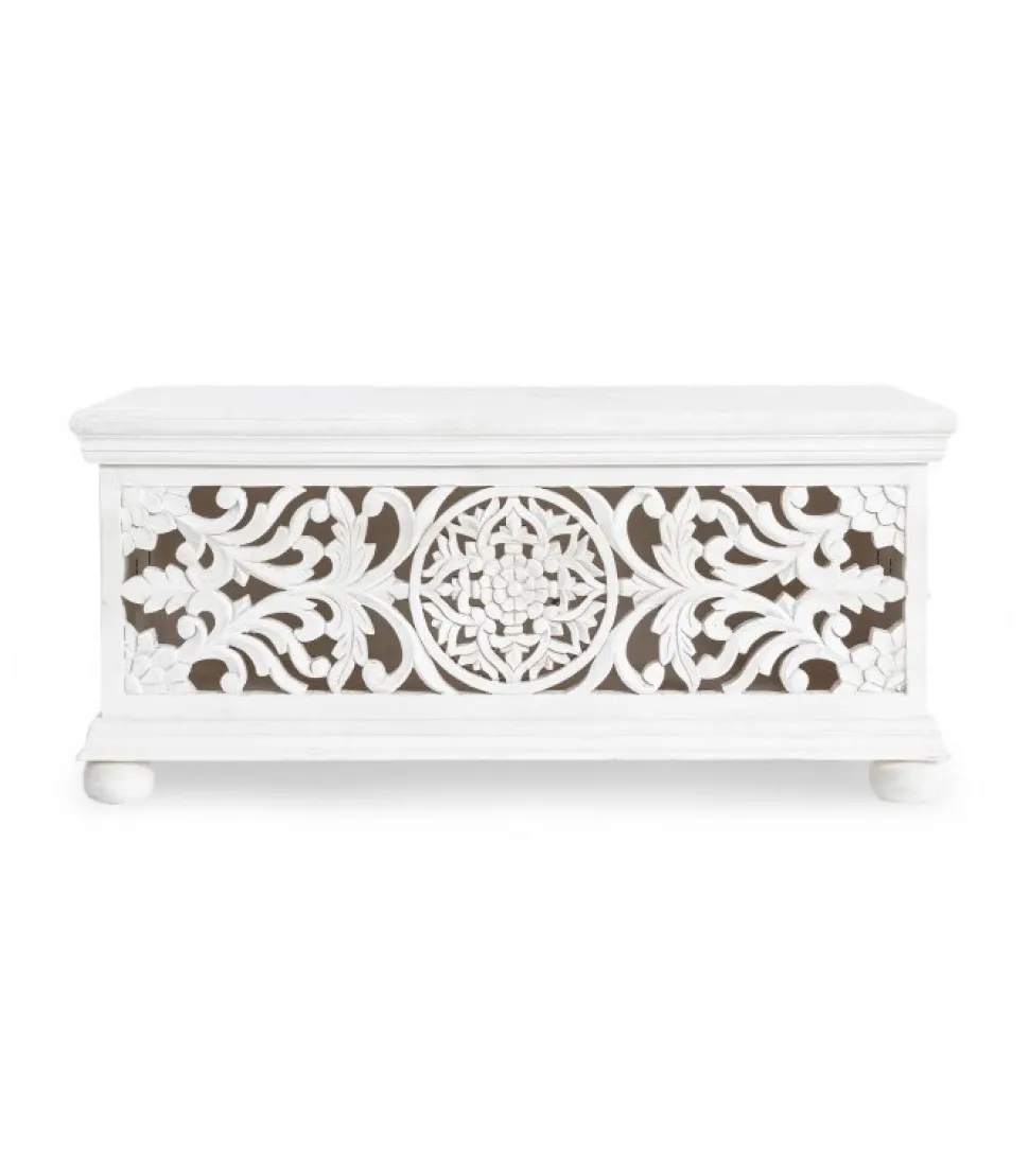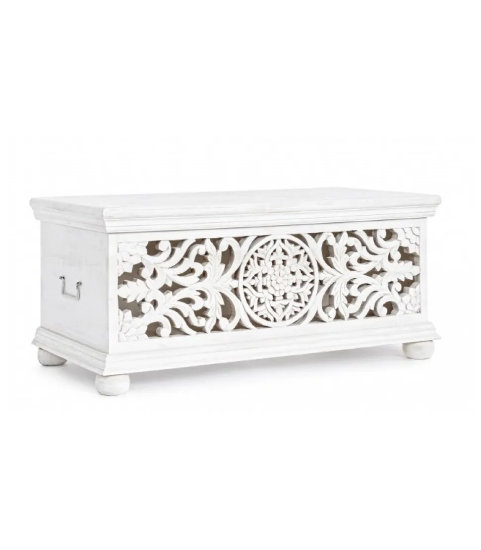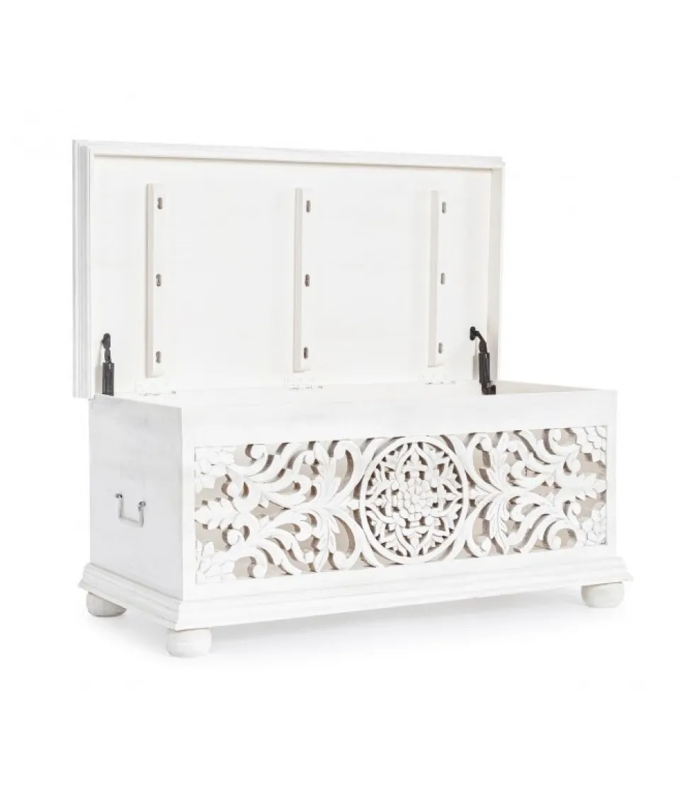 Cassapanca Alinta Struttura In Legno Di Mango Con Ante Intarsiate A Mano, Schienale In Mdf. Finitura Con Vernice Acrilica Color Bianco Leggermente Anticato. – Dimensioni In Cm. 100 (L.) 50 (P.) 45 H