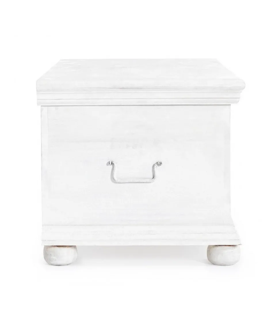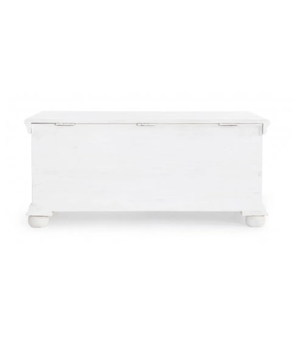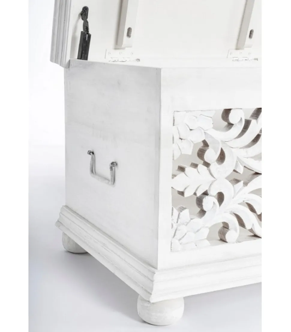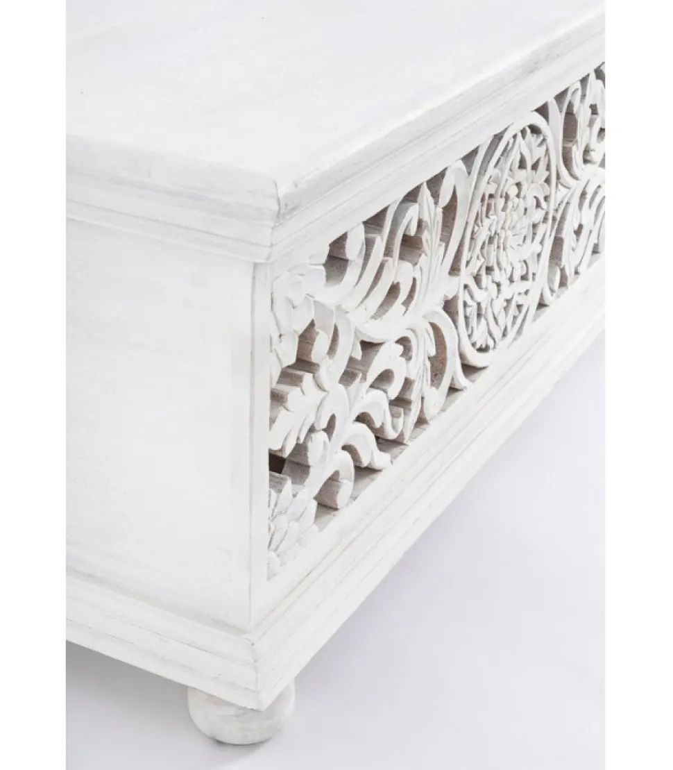 Cassapanca Alinta Struttura In Legno Di Mango Con Ante Intarsiate A Mano, Schienale In Mdf. Finitura Con Vernice Acrilica Color Bianco Leggermente Anticato. – Dimensioni In Cm. 100 (L.) 50 (P.) 45 H