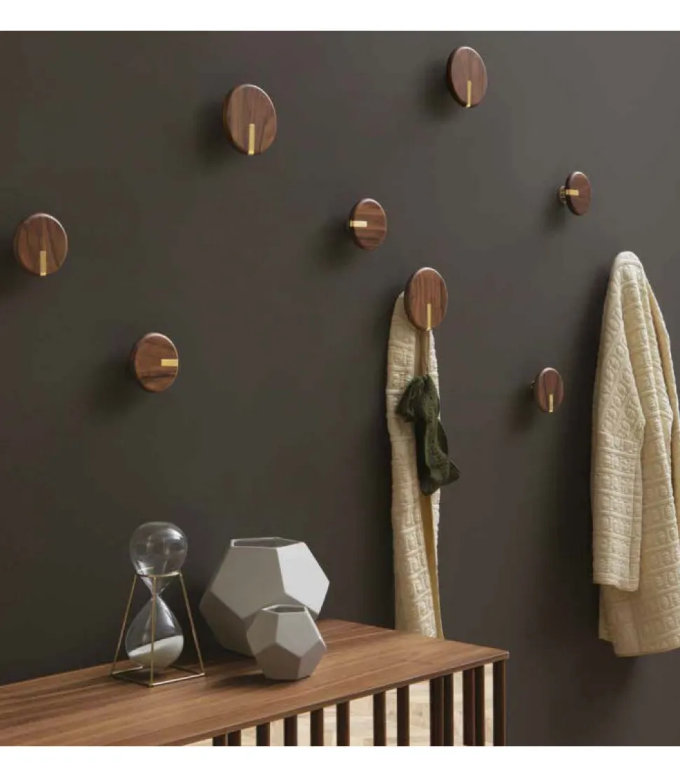 Famiglia Di Appendiabiti In Noce Massiccio Tornito Ed Impreziosito Con Eleganti Particolari In Finitura Oro. Disponibili In Due Dimensioni E Perfetti Per Dare Un Tocco Di Movimento Alla Parete.