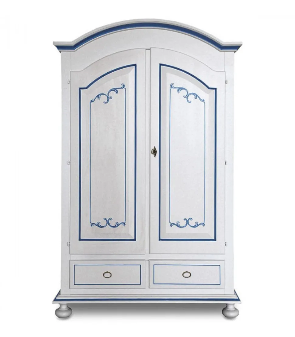 Armadio Colombina Due Ante Battenti Con Chiusura A Serratura E Due Cassetti Esterni, In Legno Massello Laccato E Decorato A Mano Con Preziosi Filetti Colore Blu.