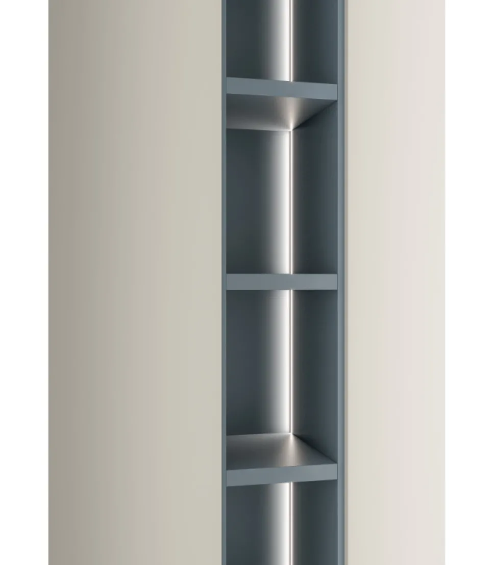 La Libreria Centrale Viene Proposta Per Spezzare La Continuita Delle Ante All’Interno Della Composizione E Puo Essere Caratterizzata Da Ripiani In Vetro O Legno.