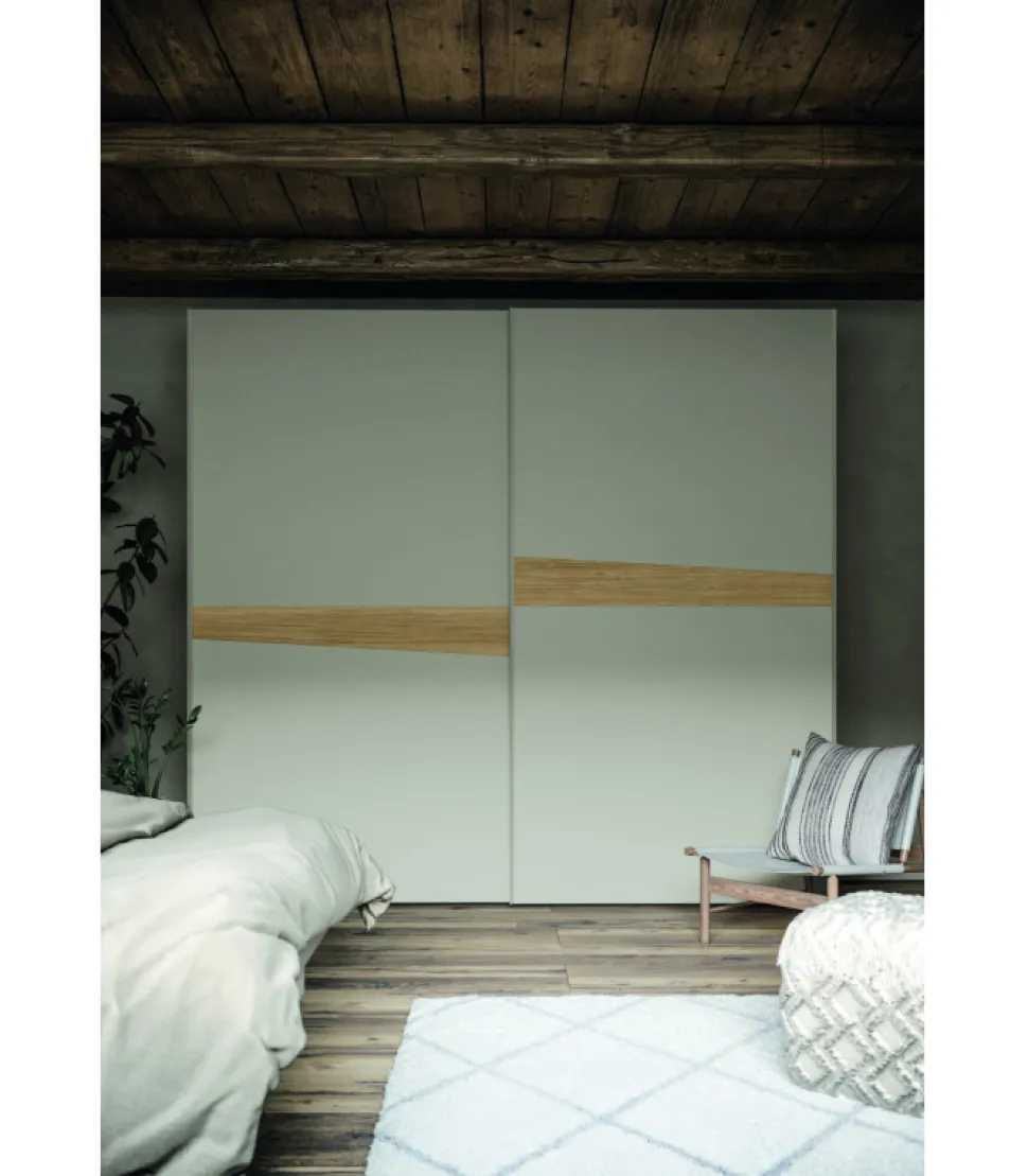 Armadio Flo’ : Armadio Scorrevole A Due Ante Essenziale Nelle Linee, Caratterizzato Da Un Inserto Centrale Dalla Forma Asimmetrica. Ogni Vano E Compreso Di Un Ripiano E 2 Tubi Appendiabiti. L’Uniformita Delle Ante Scorrevoli Viene Interrotta Da Un Inserto Asimmetrico Orizzontale, Disponibile In Diverse Finiture Per Dare Carattere A Uno Stile Dai Tratti Semplici.