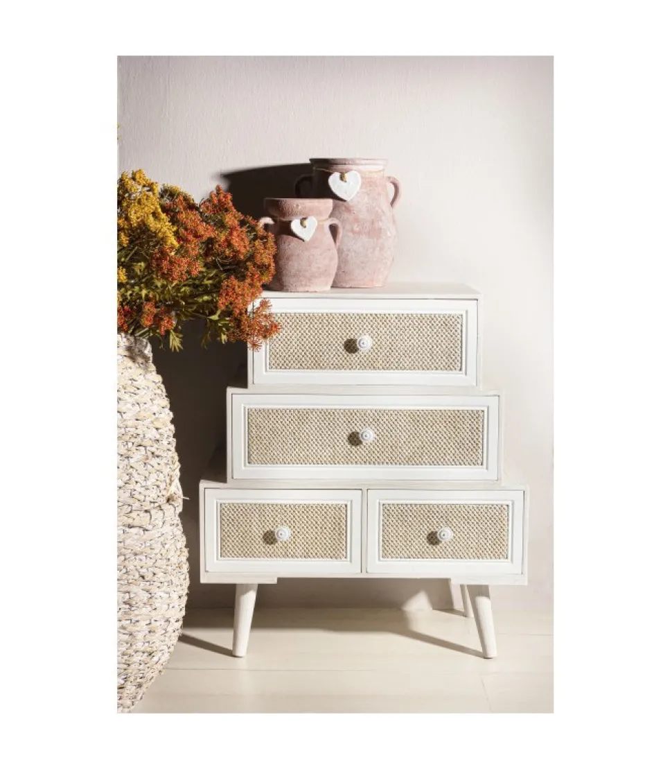 Struttura E Piedini (Da Assemblare) In Legno Di Pino. Schienali, Laterali E Cassetti In Mdf. Frontale Cassetti Rivestito In Tessuto (Cotone/Lino). Finitura Con Vernice A Base D’Acqua. Pomelli In Metallo.