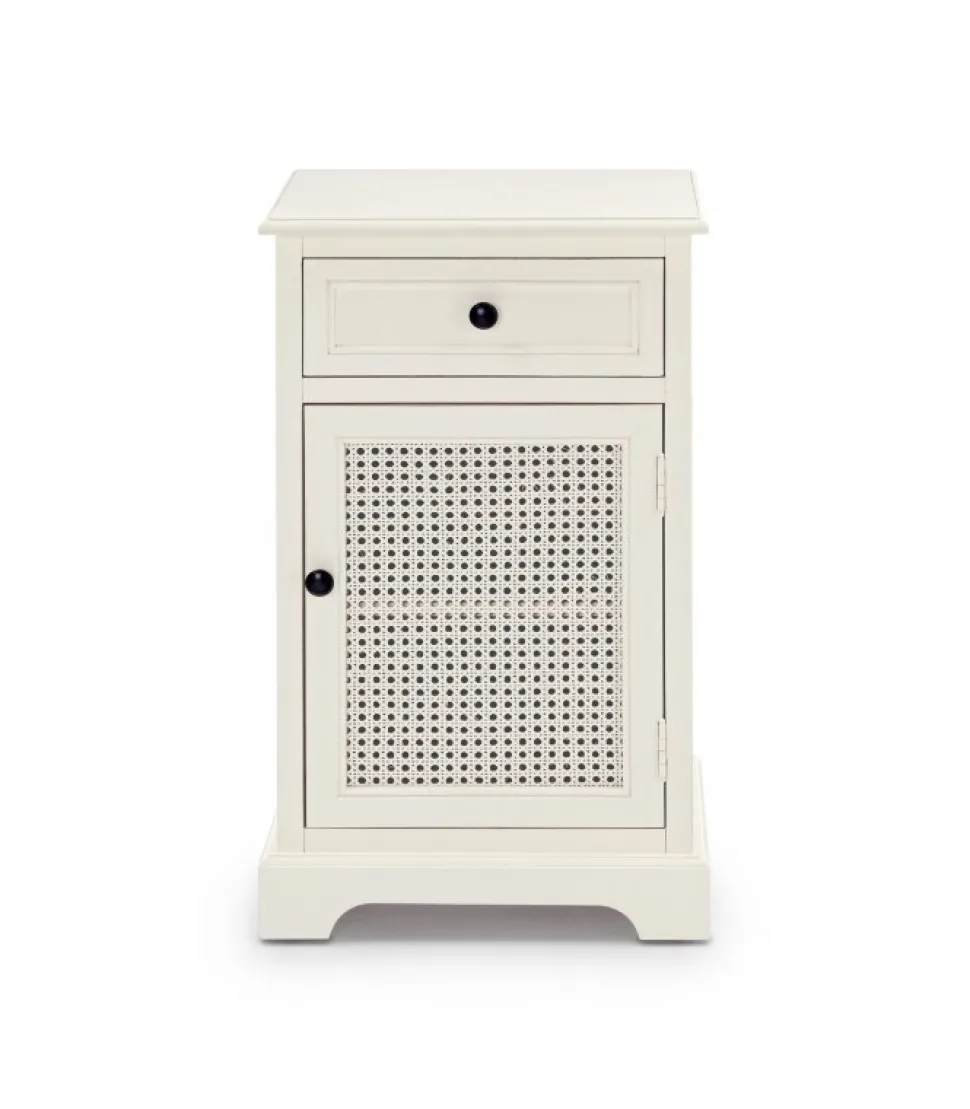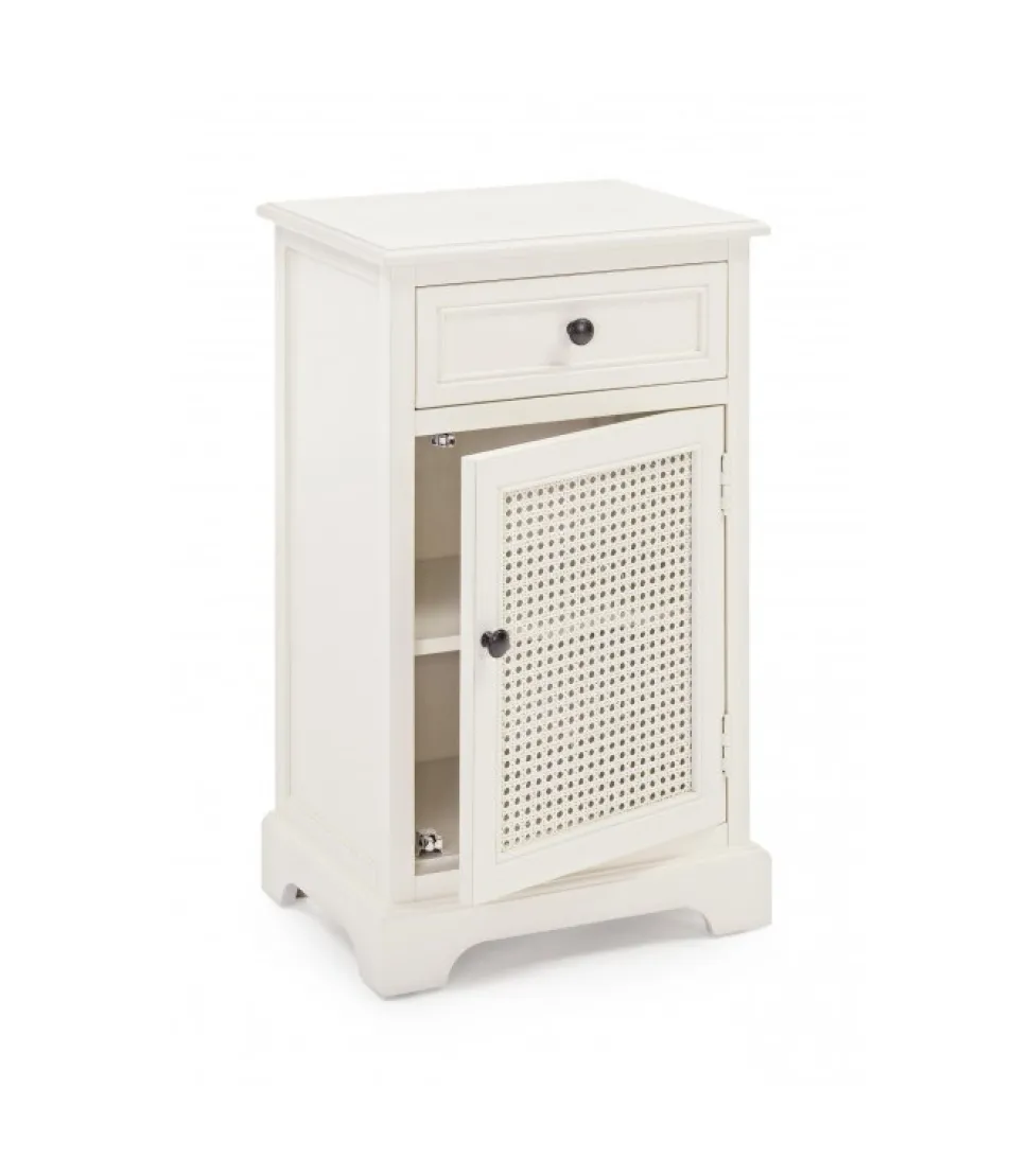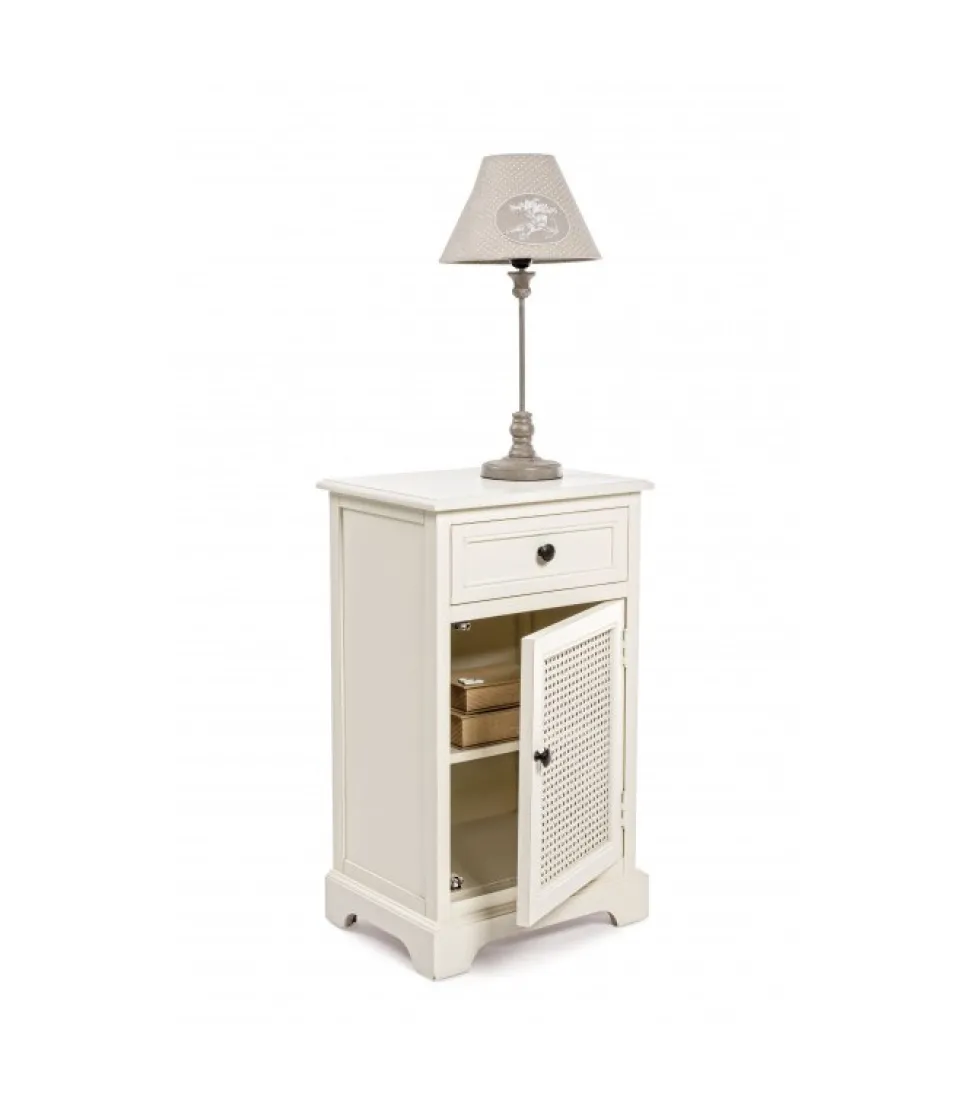 Comodino 1A-1C Amabelstruttura In Legno Di Pino- Schienali E Laterali In Mdf- Fondo Cassetti In Mdf- Inserti In Rattan- Maniglie In Zinco- Rifinitura Con Vernice A Base D’Acqua.Dimensioni:42(L) – 32(P) – 72(H)